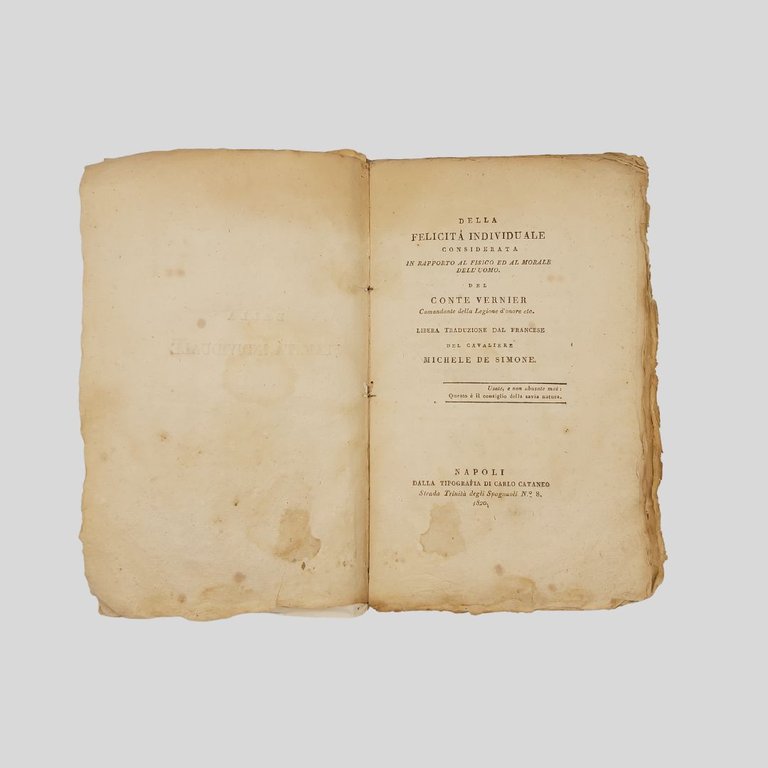 Della felicità individuale considerata in rapporto al fisico ed al morale dell’uomo. Libera traduzione dal francese di Michele De Simone. | Libri antichi e moderni | Vernier Theodore –