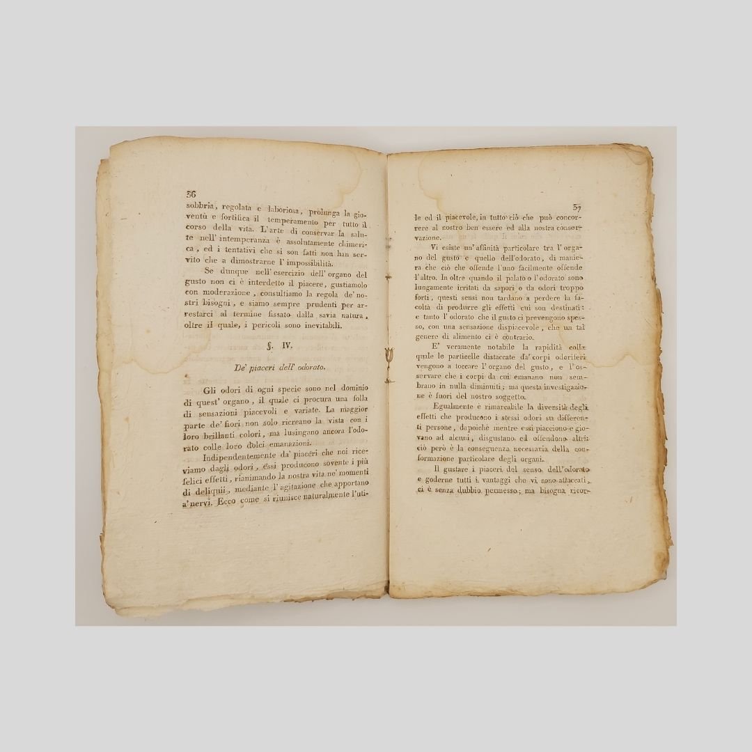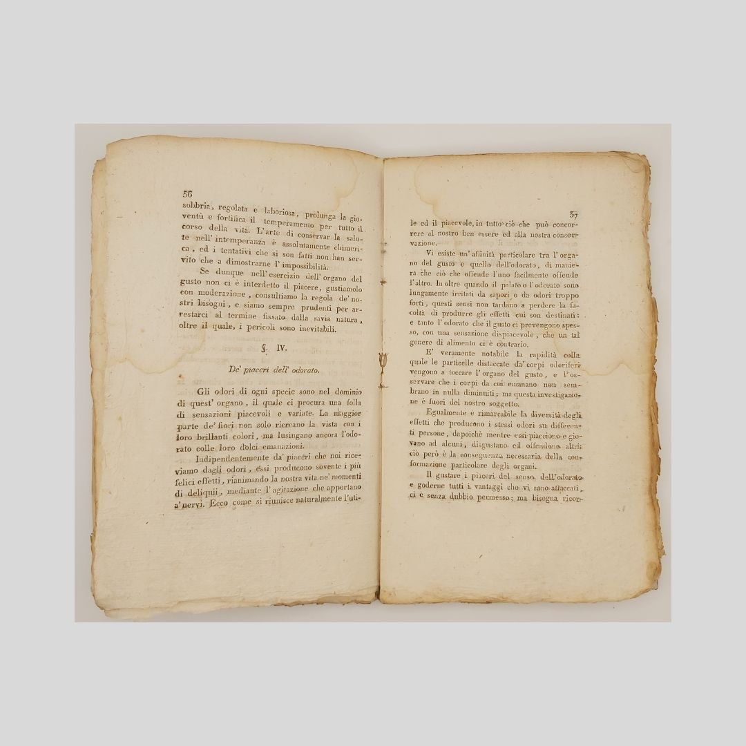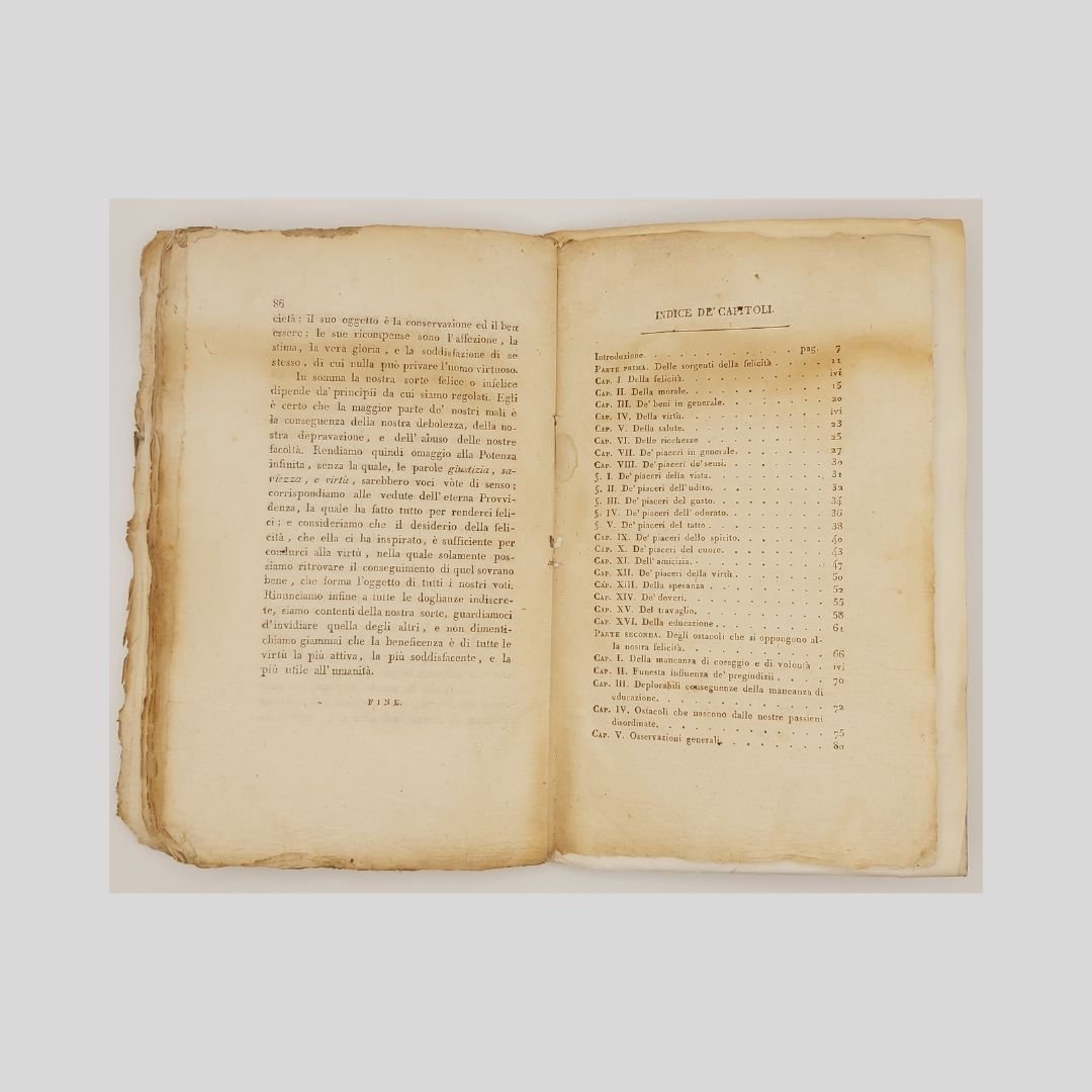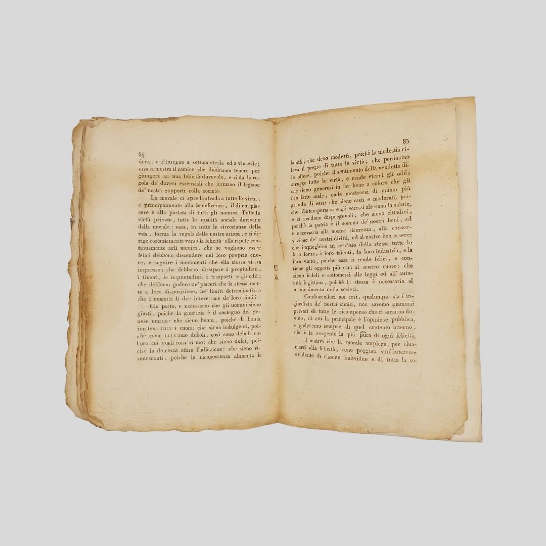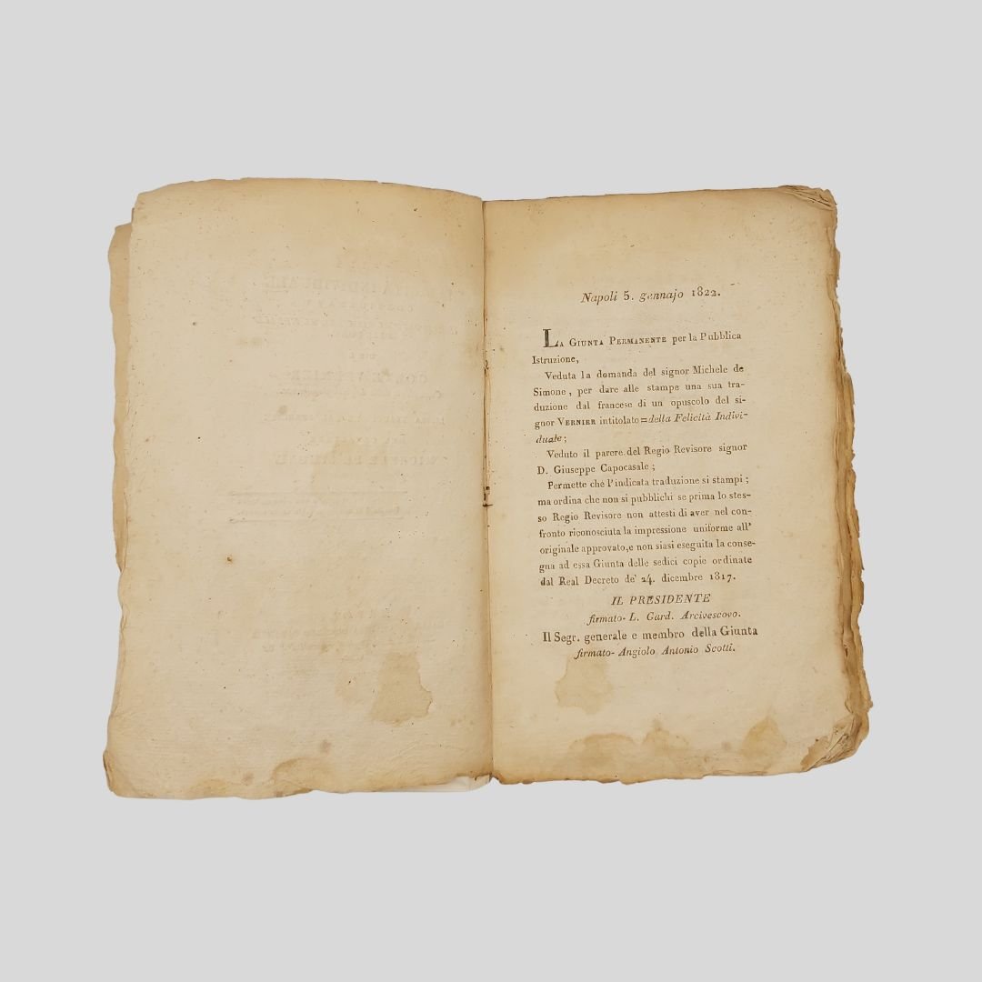 In-8° (cm 22,5), pp. 86-2 .n.n (indice), copertina muta in carta marmorizzata. Tracce d’uso, qualche alone e tracce di passaggio di tarme che non ledono il testo. Stampato su carta forte. Esemplare in barbe. ’opera presenta a p. 5 la licenza di stampa (o “Visto”) datata “Napoli, 5 gennajo 1822”, concessa dal Supremo Consiglio di Pubblica Istruzione a firma di Angiolo Antonio Scotti. La discrepanza con la data al frontespizio (1820) è dovuta alla sospensione editoriale causata dai moti costituzionali di Napoli (1820-21); la pubblicazione fu autorizzata solo con il ritorno all’ordine borbonico, in applicazione del Reale Decreto del 24/12/1818 sulla revisione delle opere straniere tradotte. La teoria del bonheur (felicità), in particolare nel contesto settecentesco e illuminista, ridefinisce il rapporto tra individuo e società, fondendo la morale con la ricerca della felicità pubblica e privata. Essa si basa sull’idea che un ordine sociale giusto debba promuovere la felicità dei cittadini, trasformando il “diritto alla felicità” in un principio di governo.