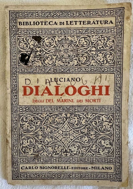 Edizione Signorelli della collana "Biblioteca di letteratura" dell'opera classica "Dialoghi degli Dei marini dei morti" di Luciano. Traduzione e note di Gina Calzavara. Graziose brossure con decorazioni. Note manoscritte. In buone condizioni. Copertina editoriale in buone condizioni con lievi usure ai margini e dorso. Legatura in buone condizioni. All'interno le pagine si presentano in buone condizioni con fioriture. In 16. Dim. 15x10,5 cm. Pp.78+(1).Signorelli edition of the series "Biblioteca di letteratura" of the classic work "Dialoghi degli Dei marini dei morti" by Luciano. Translation and notes by Gina Calzavara. Nice decorations on the covers. Handwritten notes. In good conditions. Editorial cover in good conditions lightly worn in the extremities. Binding in good conditions. Inside pages are in good conditions with foxings. In 16. Dim. 15x10,5 cm. Pp.78+(1).