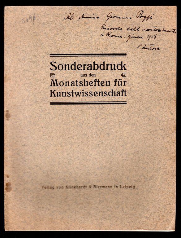 Opuscolo vintage in-8° con 10 pagg, Leipzig, 1908. Saggi. Testo in lingua tedesca. Estratto da Monatsheften fur Kunstwissenschaft. I. Jahrg - Heft 6 - 1908. Illustrazioni in bn all'interno del testo. Dedica autografa dell'autore in copertina.