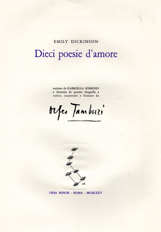 Quattro litografie per Emily DIckinson di Orfeo Tamburi. Traduzione di Gabriella Sobrino. Un'illustrazione in bianco e nero di Orfeo Tamburi Esemplare n. 43. La parte tipografica è stata curata dalla tipografia Mario Sticca di Roma . 4to (cm 35x25,5). pp. 22. . Molto buono (Very Good). Esemplare mancante delle 4 litrografie (Copy without the 4 original prints). Edizione originale di 99 es. numerati. .