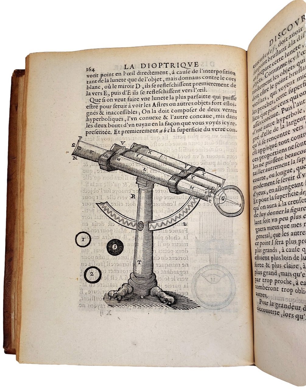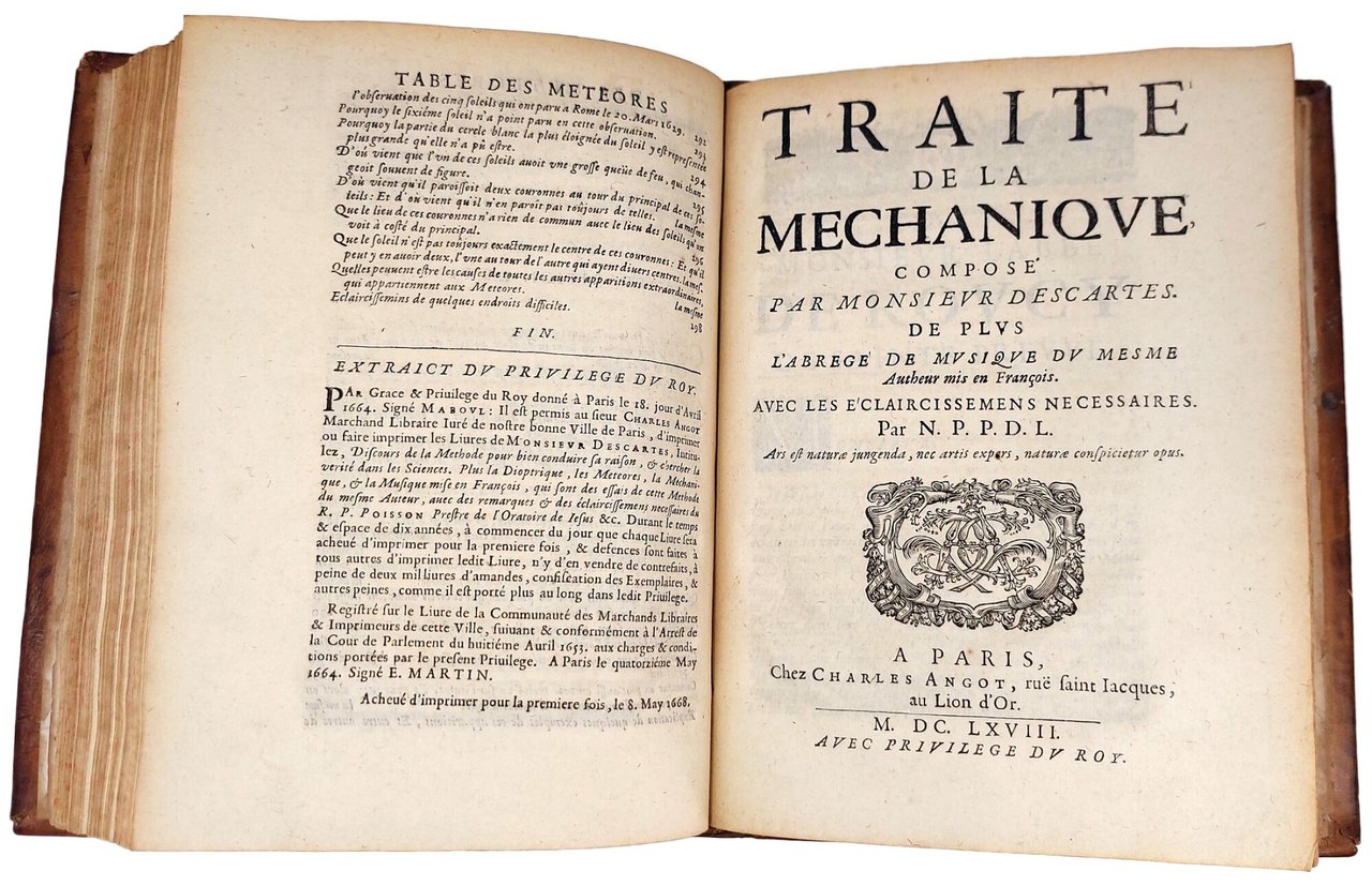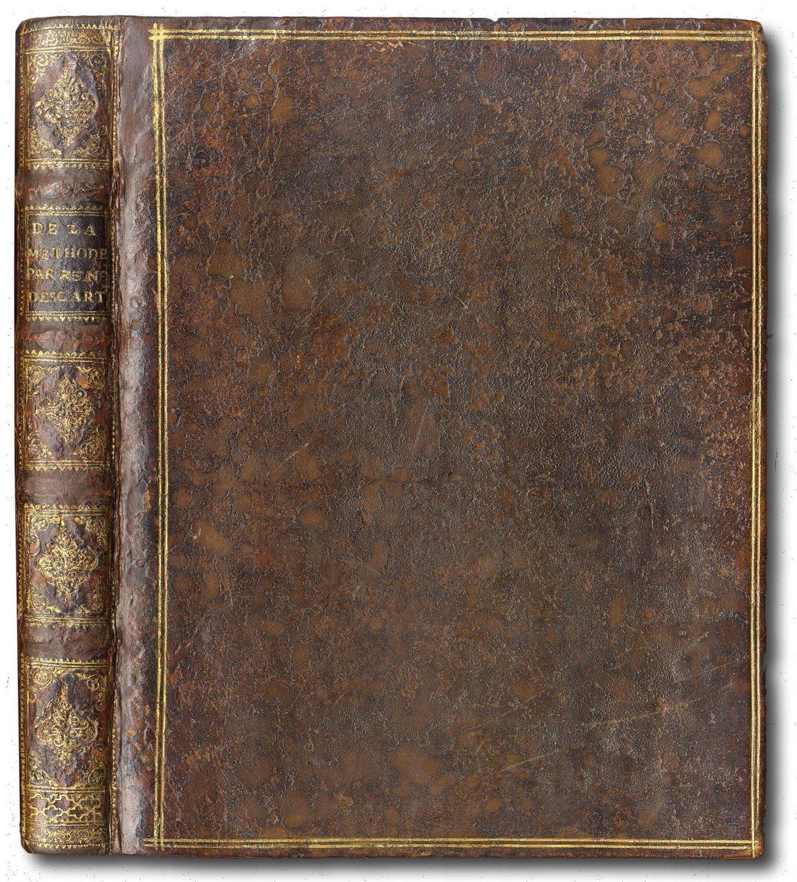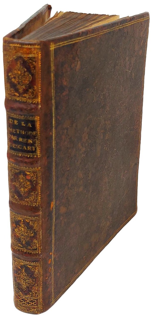 >in-4, 2 parti in un volume, pp. 303, (23) per la prima parte (''Discours de la Méthode. La Dioptrique. Les Meteores''); pp. 127, (1), per la seconda parte (''Traité de la Mechanique. Abbregé de la Musique''). Impresa dello stampatore Angot sul titolo, iniziali e finalini di pagina istoriati. Nel testo numerose figure scientifiche di grande interesse. Ottima legatura coeva in piena pelle marmorizzata, doppio filetto oro sui piatti, abilmente rifatte le cerniere e le cuffie , dorso con titolo e fregi oro. Buon esemplare di questa ottima rara edizione, la prima che riunisca tutti i trattati del grande filosofo e scienziato francese (1596-1650), il quale dedicò la vita al progresso di queste scienze e ne fu il ''moderno'' innovatore: il suo ''Discours' (scritto in Olanda ove il libero pensiero era maggiormente autorizzato, ivi pubblicato per la prima volta nel 1637, prezioso e rarissimo), fu la base dei suoi studi in vari campi. Il ragionamento e la verità del pensiero umano (''cogito, ergo sum'') portarono, in seguito, alle importanti scoperte fatte da Locke, Leibnitz e Newton. Bell'esemplare con buoni margini, leggera bunitura della carta. Horblit, n.24 ''fundamental work in philosophy and on the method of science…''. Dibner, 81. Printing and the mind of man, 129.