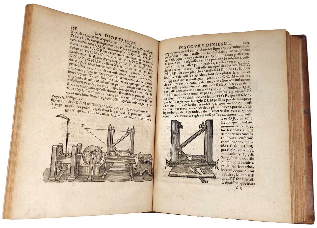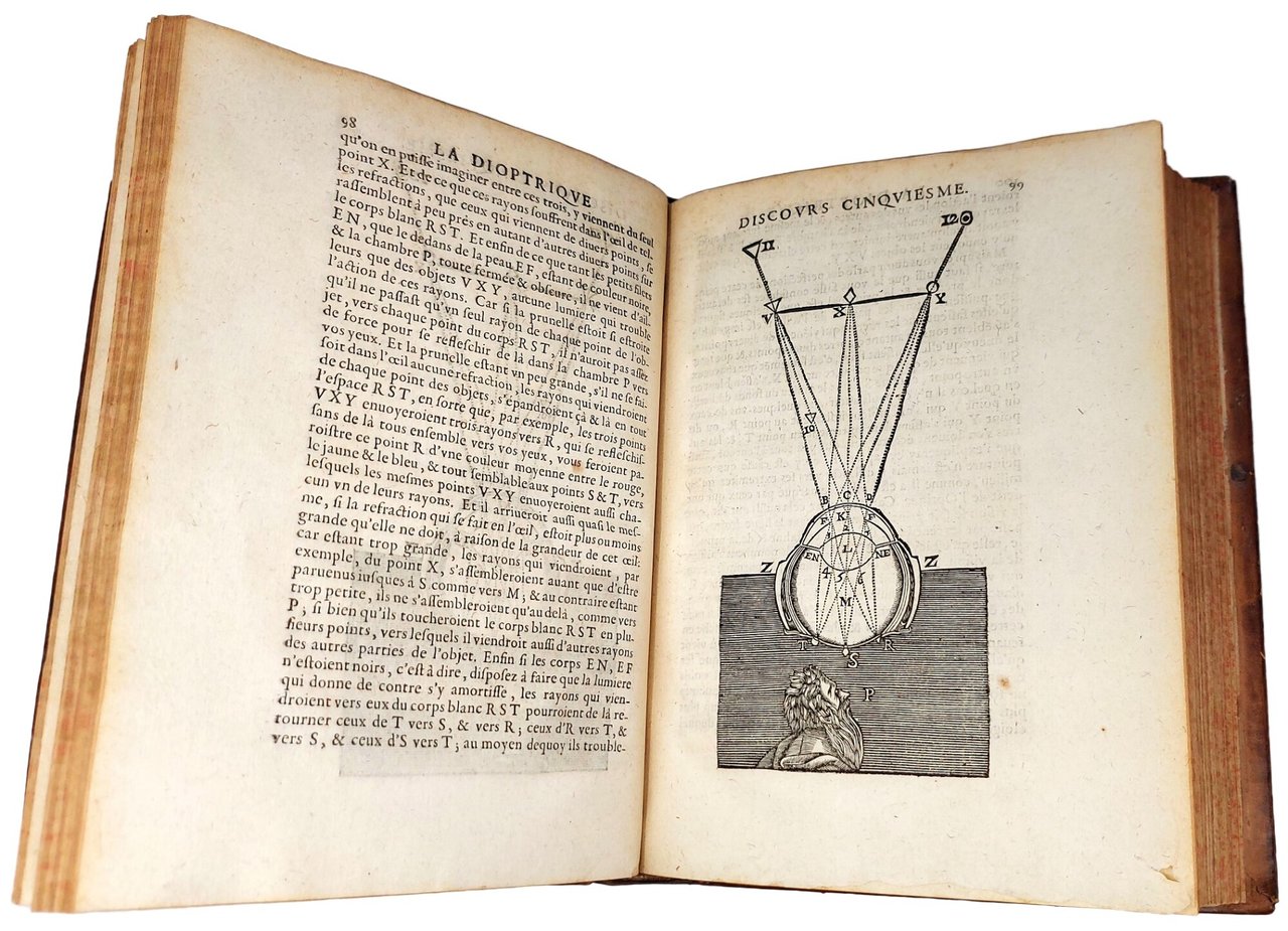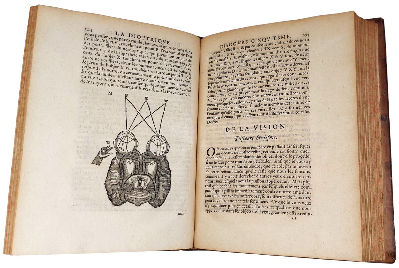 >in-4, 2 parti in un volume, pp. 303, (23) per la prima parte (''Discours de la Méthode. La Dioptrique. Les Meteores''); pp. 127, (1), per la seconda parte (''Traité de la Mechanique. Abbregé de la Musique''). Impresa dello stampatore Angot sul titolo, iniziali e finalini di pagina istoriati. Nel testo numerose figure scientifiche di grande interesse. Ottima legatura coeva in piena pelle marmorizzata, doppio filetto oro sui piatti, abilmente rifatte le cerniere e le cuffie , dorso con titolo e fregi oro. Buon esemplare di questa ottima rara edizione, la prima che riunisca tutti i trattati del grande filosofo e scienziato francese (1596-1650), il quale dedicò la vita al progresso di queste scienze e ne fu il ''moderno'' innovatore: il suo ''Discours' (scritto in Olanda ove il libero pensiero era maggiormente autorizzato, ivi pubblicato per la prima volta nel 1637, prezioso e rarissimo), fu la base dei suoi studi in vari campi. Il ragionamento e la verità del pensiero umano (''cogito, ergo sum'') portarono, in seguito, alle importanti scoperte fatte da Locke, Leibnitz e Newton. Bell'esemplare con buoni margini, leggera bunitura della carta. Horblit, n.24 ''fundamental work in philosophy and on the method of science…''. Dibner, 81. Printing and the mind of man, 129.