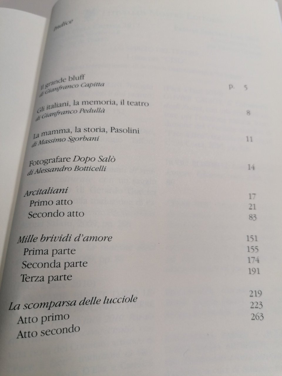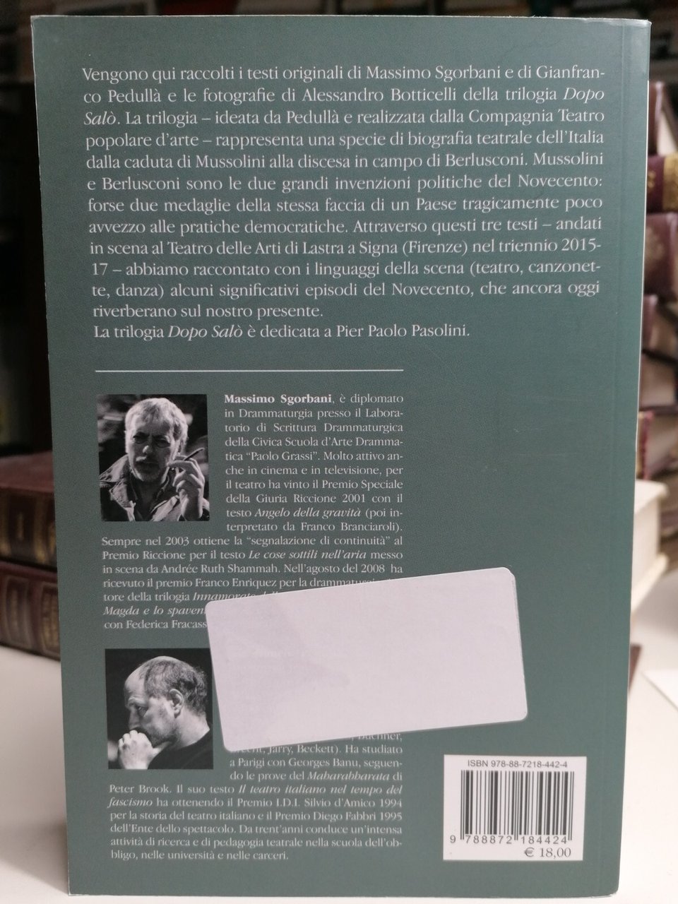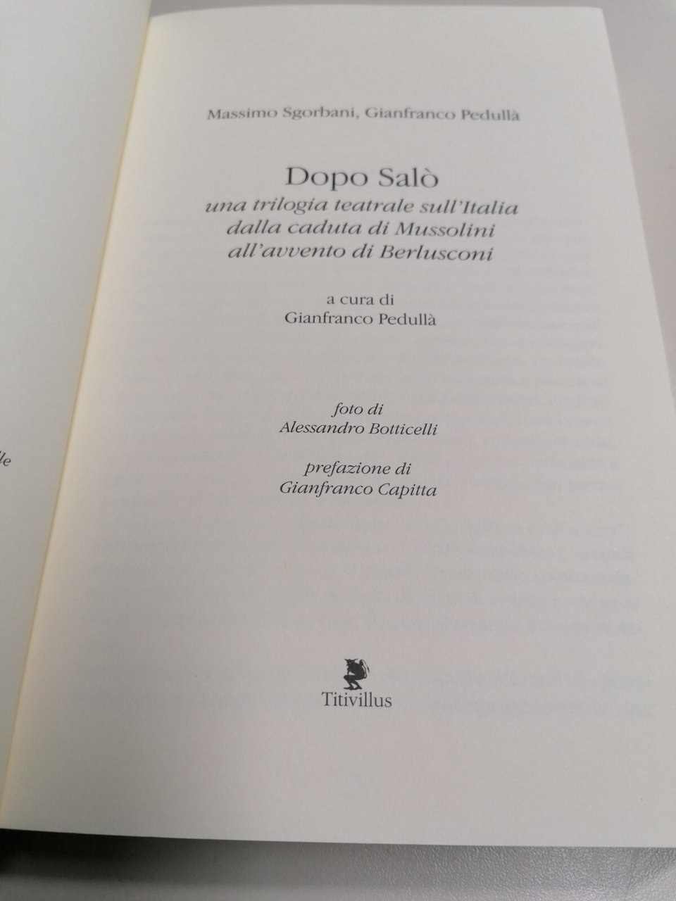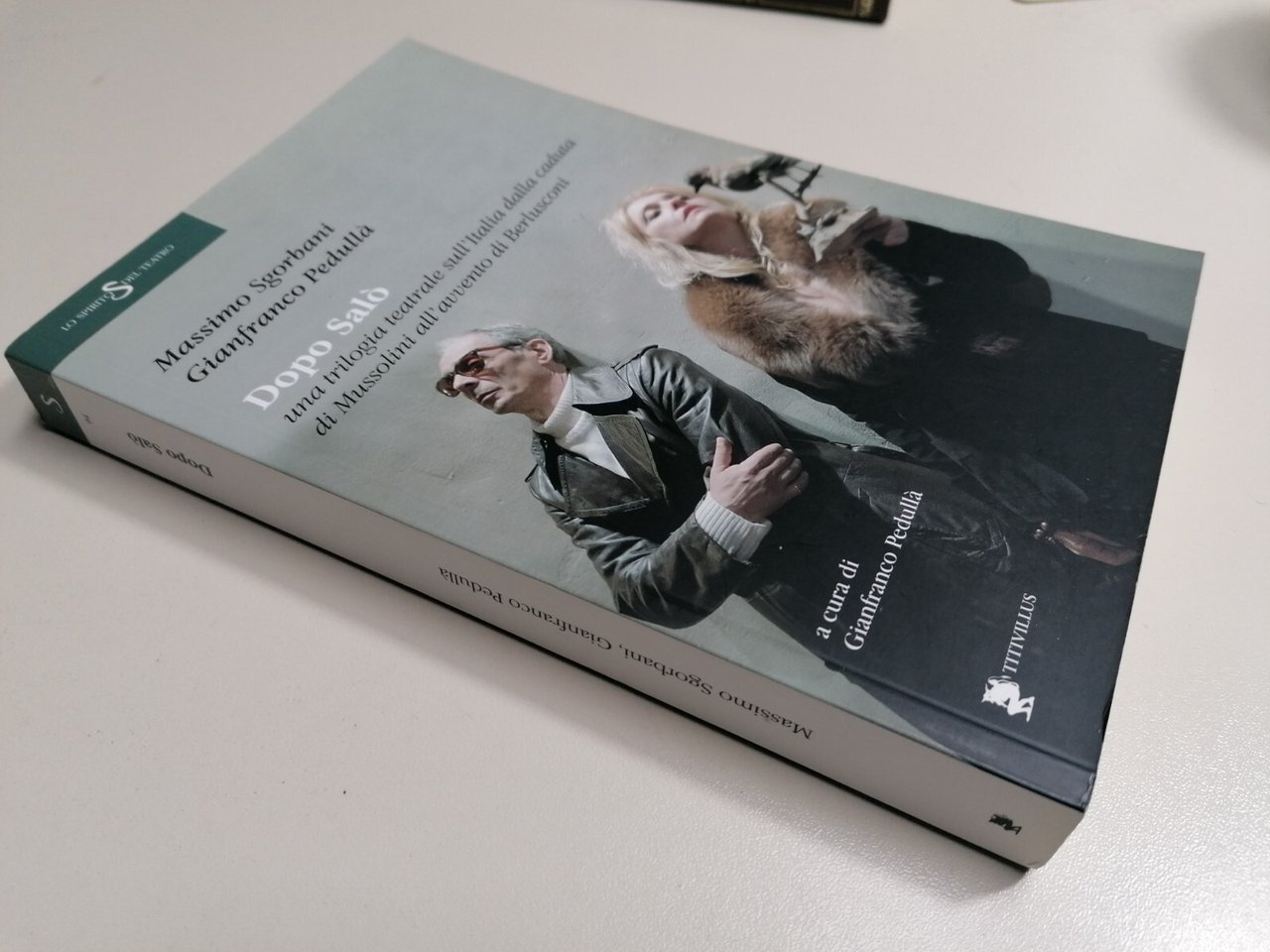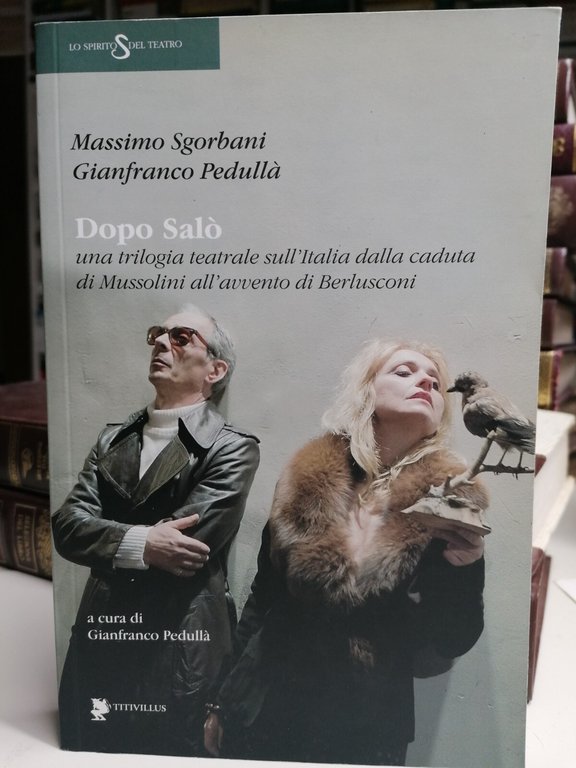 Editore: Titivillus Collana: Lo spirito del teatro Illustratori: Botticelli A. Data di Pubblicazione: 2018 EAN: 9788872184424 ISBN: 8872184428 Pagine: 304 Formato: brossura Argomenti: ANTOLOGIE (ESCLUSE LE ANTOLOGIE DI POESIE) Condizioni: più che buone 1E-11-3 Descrizione del libro Vengono qui raccolti i testi originali di Massimo Sgorbani e di Gianfranco Pedullà e le fotografie di Alessandro Botticelli della trilogia "Dopo Salò". La trilogia - ideata da Pedullà e realizzata dalla Compagnia Teatro popolare d'arte - rappresenta una specie di biografia teatrale dell'Italia dalla caduta di Mussolini alla discesa in campo di Berlusconi. Mussolini e Berlusconi sono le due grandi invenzioni politiche del Novecento: forse due medaglie della stessa faccia di un Paese tragicamente poco avvezzo alle pratiche democratiche. Attraverso questi tre testi - andati in scena al Teatro delle Arti di Lastra a Signa (Firenze) nel triennio 2015-17 - abbiamo raccontato con i linguaggi della scena (teatro, canzonette, danza) alcuni significativi episodi del Novecento, che ancora oggi riverberano sul nostro presente. La trilogia "Dopo Salò" è dedicata a Pier Paolo Pasolini.