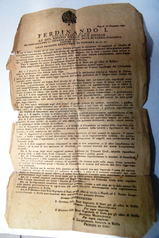 Editto di ferdinando I re del regno delle due sicilie recante norme per far esercitare i giudici nei capoluoghi della sicilia. Napoli 1821 Ottime Morbida .
