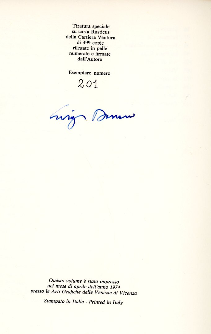 Tiratura speciale su carta Rusticus della cartiera Ventura di 499 copie rilegate in pelle e firmate dall'Autore. 8vo. pp. 124. . Ottimo (Fine). . Prima edizione (First Edition). Letteratura italiana del 900 [Gambetti, 2007] Gambetti Lucio, Vezzosi Franco, Rarità bibliografiche del Novecento italiano. Repertorio delle edizioni originali. Milano, Edizioni Sylvestre Bonnard, 2007.