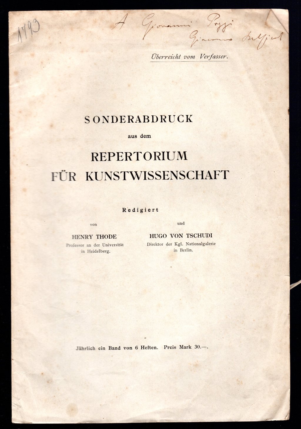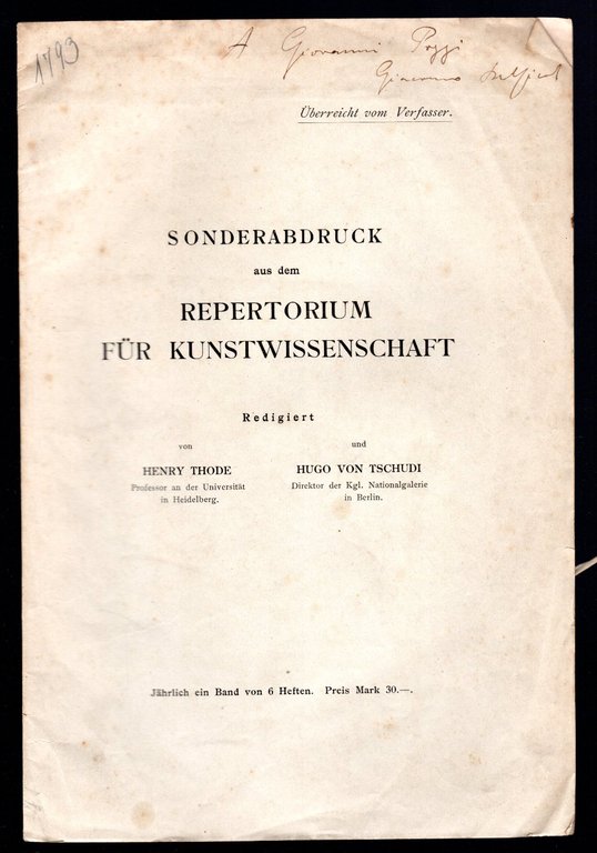 Opuscolo vintage in-8° con 5 pagg. Saggi. Estratto da Repertorium fur kunstwissenschaft. Dedica autografa dell'autore in copertina.