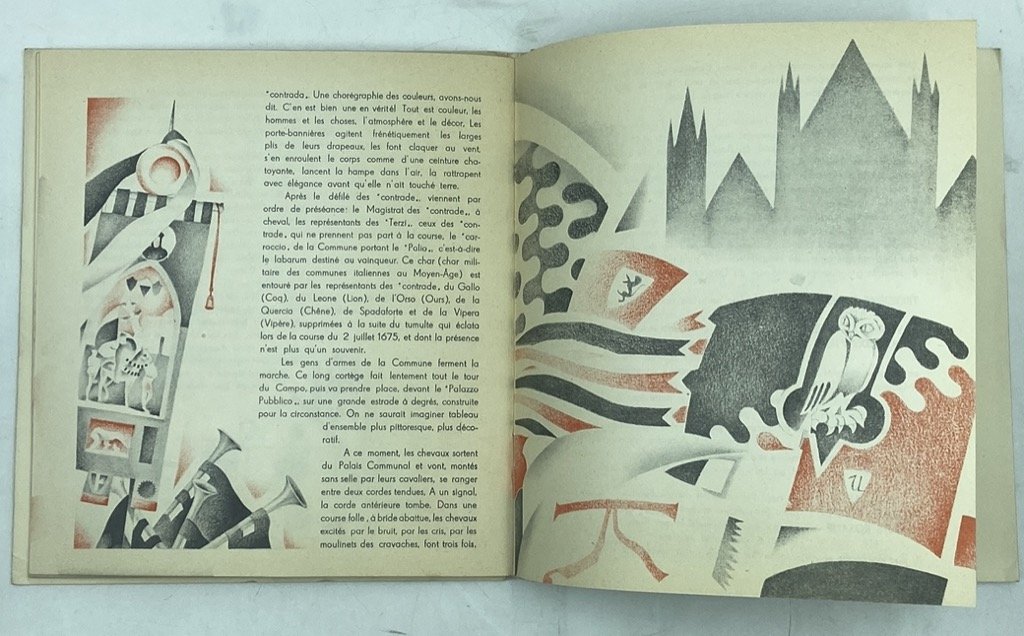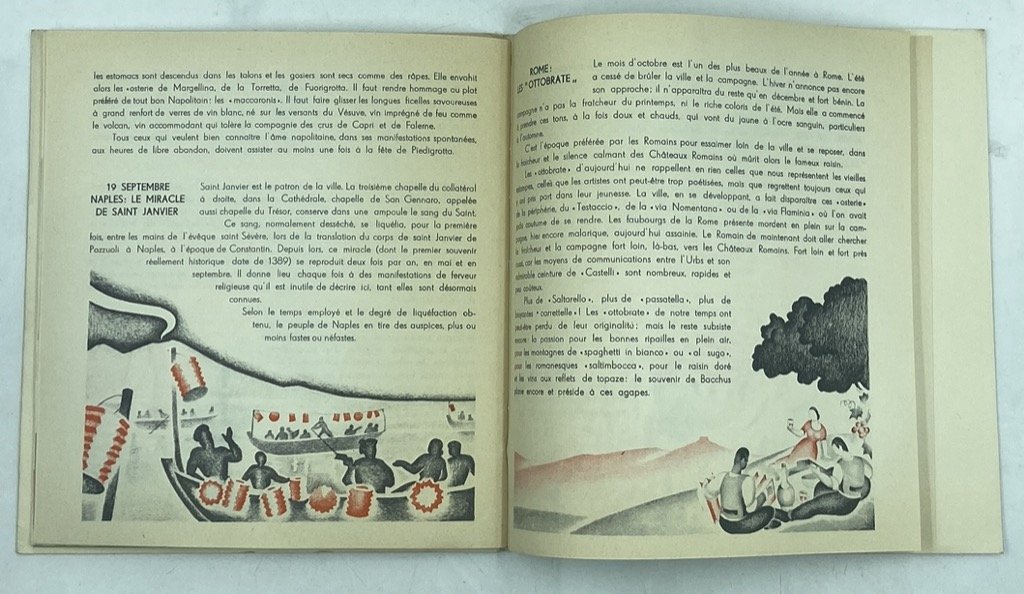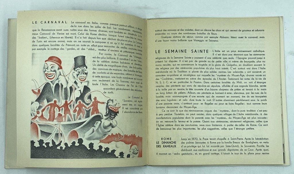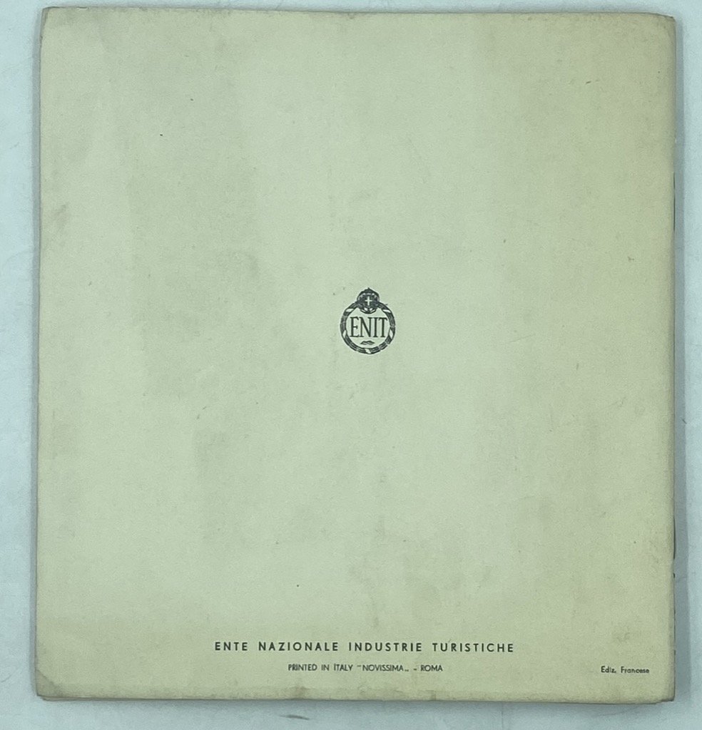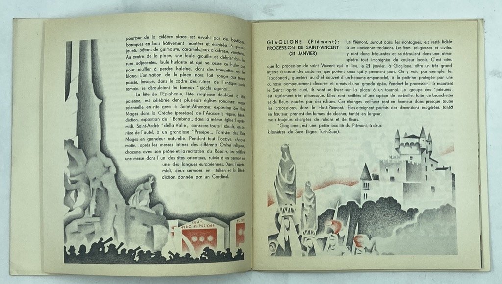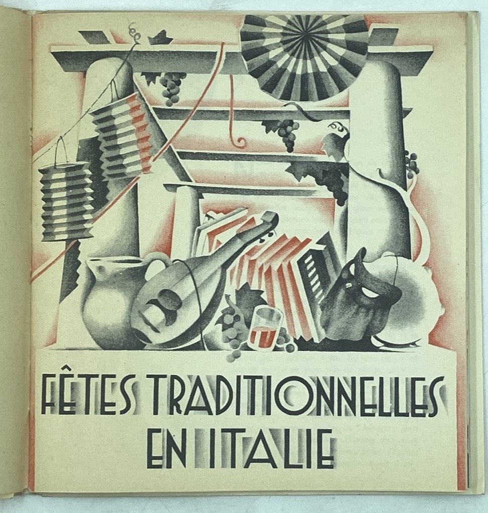 Opuscolo spillato in brossura illustrata, cm 19 x 17.5, pp (48) illustrate in bicromia. Ottimo stato. Edizione francese dell’opuscolo pubblicato dall’Ente Nazionale Industrie Turistiche con la descrizione di numerose feste popolari di svariate località italiane. Seguendo il calendario dall’Epifania a Roma al Natale che «toute l’Italie fête» l’opuscolo descrive manifestazioni folcloristiche in tutta Italia, dalle più celebri e frequentate, come il Palio di Siena e la Festa di Piedigrotta a Napoli, a quelle meno note come la Processione di San Vincenzo a Giaglione e quella al Santuario di Barbana a Grado; al Carnevale è dedicato un capitoletto che cita quelli di Torino, Viareggio e Sanremo. Il testo è accompagnato da eleganti illustrazioni di gusto deco nei toni del rosso e del nero, che evidenziano caratteristiche delle feste e monumenti coinvolti; il frontespizio è illustrato da una pergola con vitigni, festoni, strumenti musicali, maschere, vino. La serie di tavole non è firmata, e la pubblicazione si discosta dai più comuni pieghevoli turistici dell'ENIT (brochures illustrate solitamente da fotografie in rotocalco) rispecchiando la più raffinata estetica dei manifesti prodotti all'epoca dall'Ente, che impiegò artisti affermati e vicini alle avanguardie come Marcello Dudovich, Marcello Nizzoli, Ruggero Amelio Michaelles, Viriglio Retrosi e Mino Delle Site. Il testo fu pubblicato anche in formato minore, con copertina di Duilio Cambellotti e illustrazioni del tutto differenti. Raro e non reperito, a differenza dell'altra versione, in ICCU.