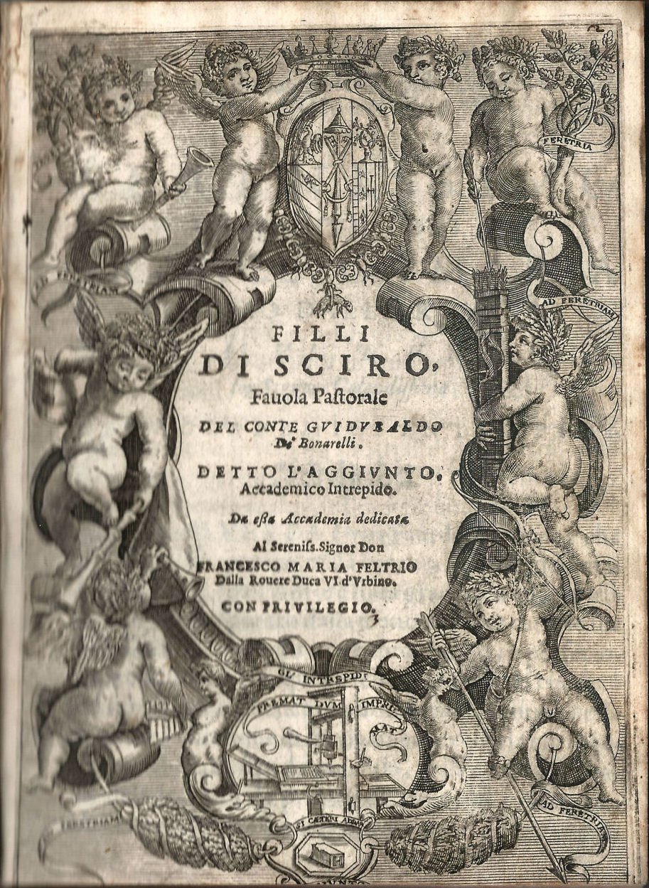 Filli di Sciro, favola pastorale del conte Guidubaldo de' Bonarelli detto l'Aggiunto, Accademico Intrepido. Da essa Accademia dedicata al sereniss. sig. don Francesco Maria Feltrio della Rovere duca VI d'Urbino.