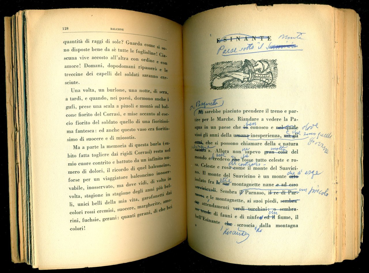 Riproduzione di 16 piccoli disegni in nero di Bartolini all'inizio di ciascun capitolo. Copia personale dell'Autore con numerose correzioni e varianti autografe a penna alla prefazione, al testo e alle illustrazioni . 8vo. pp. 202. . Molto buono (Very Good). . Prima edizione (First Edition). Letteratura italiana del 900 [Gambetti, 2007] Gambetti Lucio, Vezzosi Franco, Rarità bibliografiche del Novecento italiano. Repertorio delle edizioni originali. Milano, Edizioni Sylvestre Bonnard, 2007.