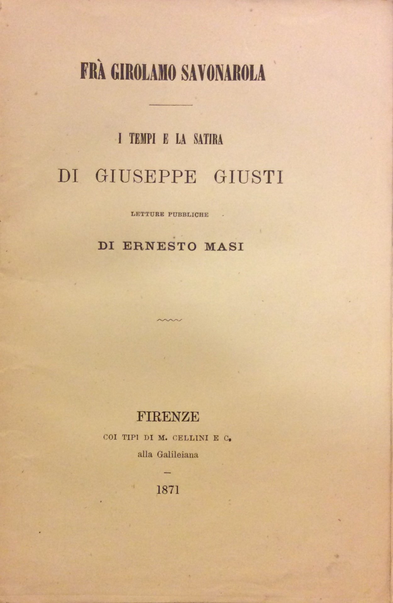 FRA GIROLAMO SAVONAROLA - I TEMPI E LA SATIRA DI GIUSEPPE GIUSTI. - Lettere pubbliche. | Libri antichi e moderni | MASI Ernesto