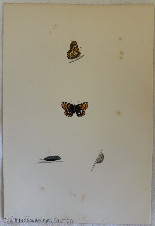 Litografia del 1870 circa colorata a mano che mostra una specie di farfalla. Nota manoscritta in lingua tedesca. In ottime condizioni. TECNICA: Litografia colorata a mano DIMENSIONI FOGLIO: cm 25x17,5 DIMENSIONI INCISIONE: cm 15,5x8 EPOCA: 1870 circaLithography of 1870 circa featuring a species of butterfly. <BR>Handwritten text in german language.<BR>In very good conditions. TECHNIQUE: lithography painted by hand<BR>PAGE SIZE: cm 25x17,5 PRINT'S SIZE: cm 15,5X8 PERIOD: 1870 circa