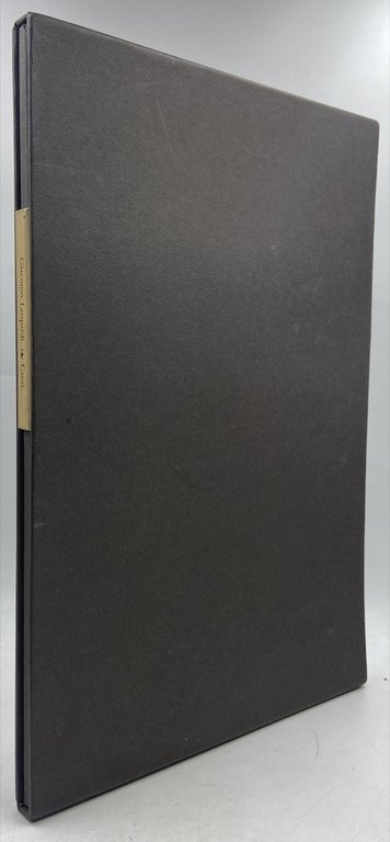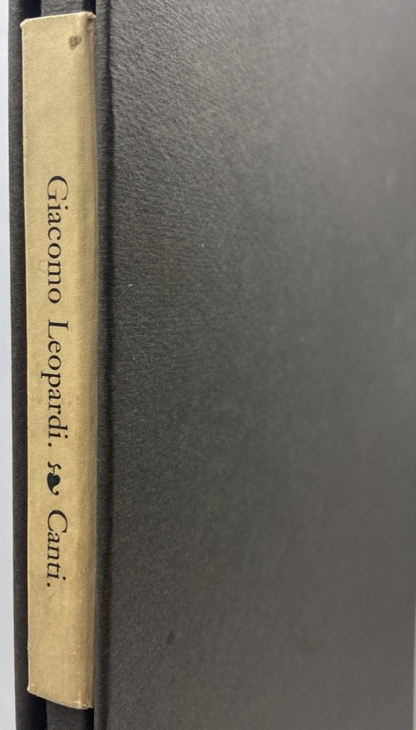 Edizione a fogli sciolti in barbe raccolti in camicia di cartoncino entro custodia rigida con titoli a stampa, in folio cm 35 x 22.5, pp (4) IV 35 (1) (4). Pregiato manufatto editoriale pubblicato dalle Arti Grafiche Flaminia, «gruppo di giovani amici di nobili intenzioni» che avrebbe voluto inaugurare una «serie di testi letterari stampati bene» di cui non ci risulta un seguito. La raffinata edizione fu tirata in 149 esemplari numerati, composti a mano in carattere Original-Janson Antiqua su carta fabbricata al tino dalle Cartiere Milani di Fabriano. Il nostro esemplare, impresso il 14 luglio del 1968 nella tipografia di Elio Boschiazzi, porta il numero XCI. Gli otto idilli leopardiani sono accompagnati da una nota introduttiva di Lorenzo Gigli che che plaude alla veste tipografica «antico-moderna», alla «purezza della architettura tipografica», al «rito purificatore, una riparazione a Leopardi tante volte stampato male». Raro, non censito in ICCU.
