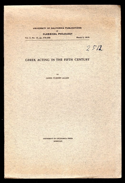 Opuscolo vintage in-8° con 11 pagg, Berkeley, 1916. Saggi. Testo in lingua inglese. University of California Publications in Classical Philology - Vol. 2, N. 15, pp. 279-289 - March 3, 1916. Note a biro in copertina.
