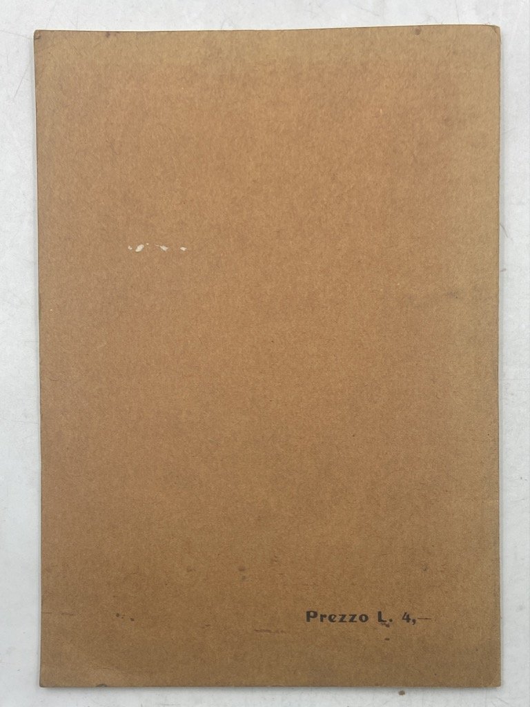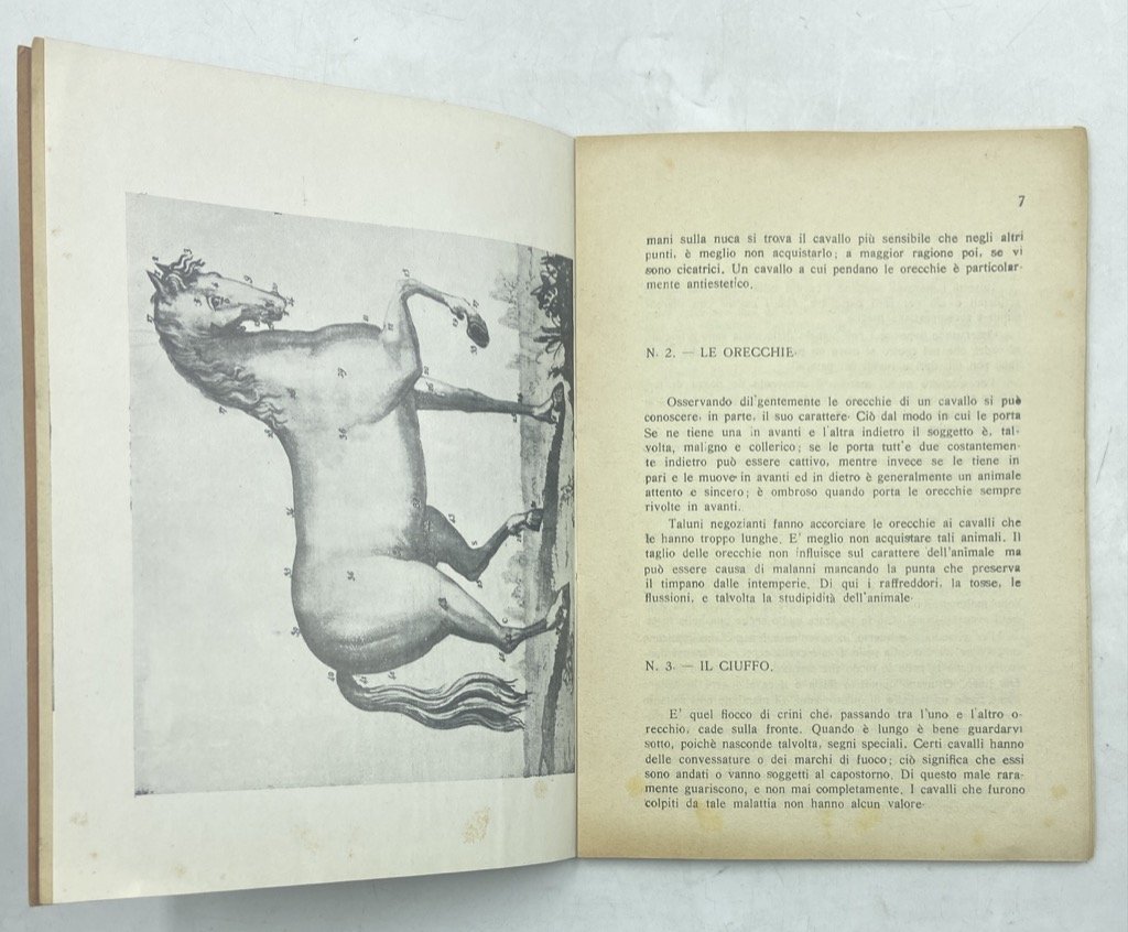 Brossura con illustrazione applicata, cm 19.5 x 13.5, pp 35 (5); 1 tavola patinata e 2 pagine con figure in nero. Raro puscolo del cocchiere Ercole Tassinari che illustra come e cosa osservare nei cavalli, trucchi dei venditori, norme per il mantenimento, ricette veterinarie.