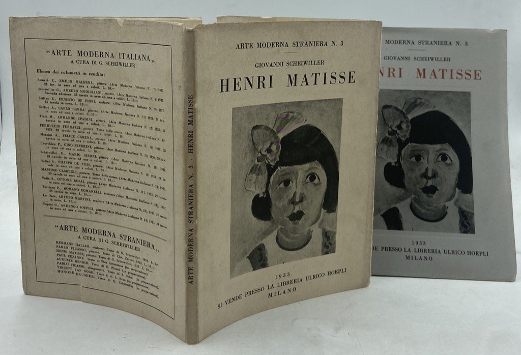 Brossura editoriale con sovraccoperta illustrata, cm 17.5 x 12.5, pp 24 (62), XXX tavole inclusa l’antiporta a colori. Difetti sulla sovraccoperta. Prima edizione, tirata in 800 esemplari numerati a macchina, numero 3 (secondo della serie pittori) della collana Arte Moderna Straniera curata da Giovanni Scheiwiller. Alla collana Arte Moderna Italiana, inaugurata nel 1925, Scheiwiller affiancò nel 1931 la serie gemella dedicata all’Arte Moderna Straniera; le collane spiccano per la straordinaria qualità testimoniando la profonda conoscenza delle arti e del loro mutamento da parte dell’editore, nonché il suo acume nella scelta degli artisti e storici dell'arte cui affidò i testi critici. Scheiwiller curò personalmente gli apparati bibliografici della serie, e firmò i testi critici di alcuni volumi, incluso questo che presenta presenta 30 opere di Matisse dal 1905 al 1938.