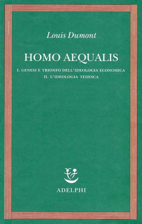 I. Genesi e trionfo dell'ideologia economica. II. L'ideologia tedesca . 8vo. pp. 642. . Perfetto (Mint). . . . Ci sono alcune idee portanti della civiltà occidentale che ci appaiono del tutto ovvie e naturali. Ma, se le osserviamo da vicino e nel contesto delle altre civiltà, scopriamo che esse hanno addirittura un carattere eccezionale ed eccentrico. Due fra queste idee sono indicate dai termini individuo ed eguaglianza. Louis Dumont si è proposto di mostrarne appunto la peculiarità, il formarsi, le implicazioni. Questo ampio disegno comprende Homo hierarchicus (1966), l'opera sino a oggi più illuminante sul sistema indiano delle caste, e i due volumi di Homo aequalis. Nel pensiero di Dumont la polarità gerarchia/eguaglianza ha una funzione fondatrice, ma dietro di essa se ne distingue un'altra: olismo/individualismo. Tra le società che conosciamo, l'individualismo moderno si presenta come un caso unico, articolato però in forme diverse. Dapprima Dumont fissa l'attenzione sul nostro rapporto con le cose e su quella disciplina dove esso diventa tematico, l'economia politica. E ci mostra come l'emanciparsi della categoria dell'economico coincida con il sorgere e il trionfare dell'«ideologia moderna». Nel secondo volume si concentra sulla comparazione fra le varianti nazionali di tale ideologia, in particolare su quella tedesca – e, a mano a mano che se ne delineano i tratti specifici, sugli «aspetti francesi più o meno corrispondenti». Da grande antropologo quale è, Dumont non si distacca mai dalla precisione del dettaglio: «Più è ambiziosa la prospettiva, più deve essere meticolosa la cura del particolare, più umile l'artigiano».