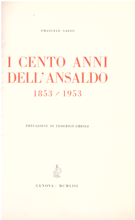 I cento anni dell'Ansaldo 1853- 1953 | Libri antichi e moderni | Gazzo Emanulele, prefazione di Federico Chessa.