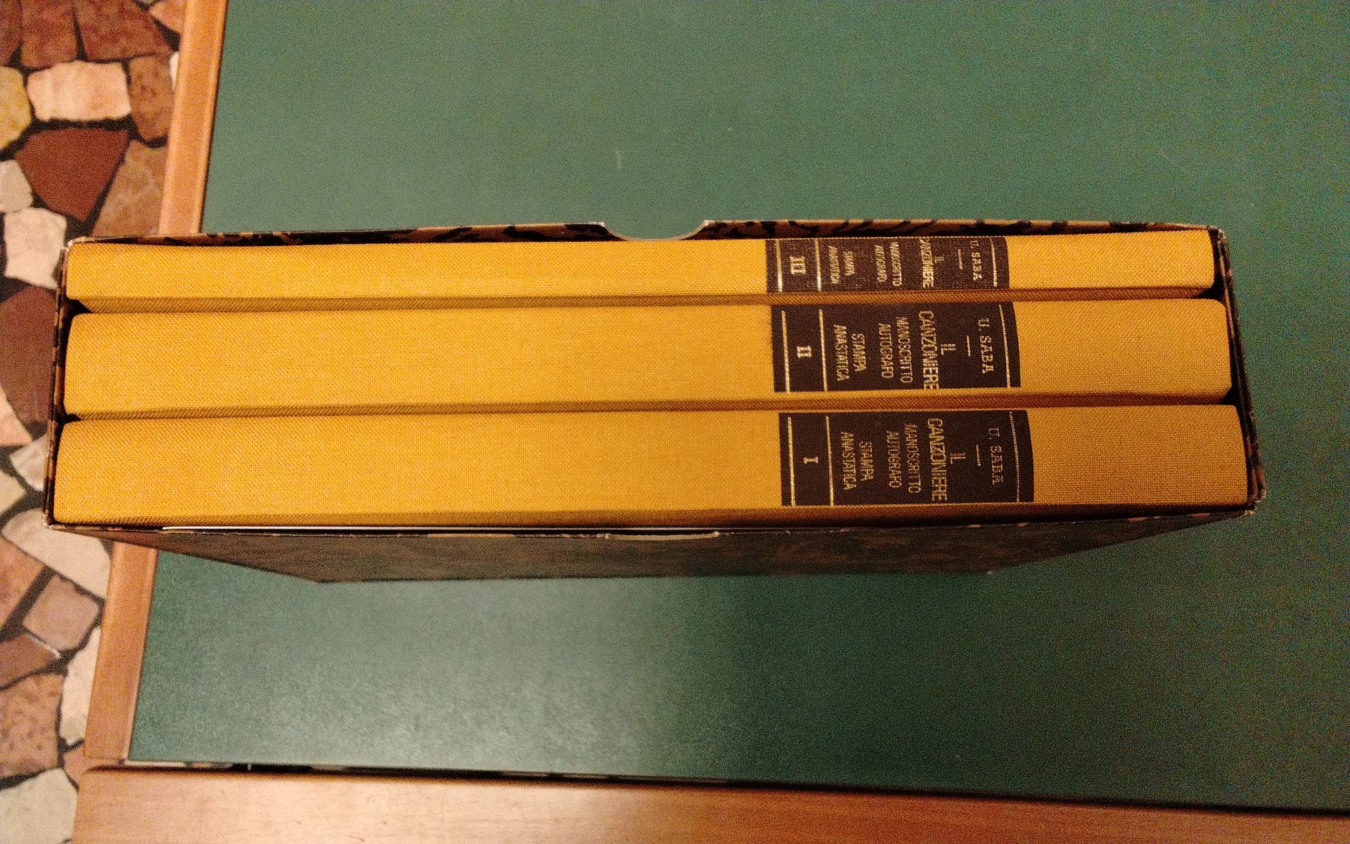 - rilegatura in mezza tela e carta francese, cofanetto in cartoncino morbido, stampa in inchiostro verde