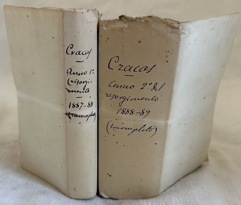 Rara raccolta di 35 numeri sciolti e undici numeri rilegati un un volume della celebre rivista romana "Il Cracas". La rivista venne fondata a inizio settecento da Giovan Francesco Cracas (o Chracas) come bollettino per la guerra tra l'Ungheria e la Turchia. Dopo la morte di Giovan Francesco la pubblicazione venne continuata dal fratello Luca Antonio e poi dala figlia con il nome di Cracas. Questo giornale si concentrava sulal vita della Corte Papale e forniva resoconti delle cerimonie religiose. Nel 1887 Costantino Maes riportò in vita le antiche forme del Diario, creando una miscellanea di notizie e curiosità romane chiamata Cracas che durò fino al 14 luglio 1893. Siamo in possesso di alcuni numeri del 1887: 3, 7, 12-13; 1888: dal 15 al 40, dal 41 al 48; indice generale dal 21 aprile 1887 al 20 aprile 1888; 1889: dal 39 al 50. Gli argomenti trattati sono i più disparati: I capestri degli impiccati, Il polverino d'arena gialla alla Casanatense, Margherita Salustri, Il sistema Gall in Cicerone, La notte di San Giovanni (I riti di Cerere, streghe, torcie a vento; Ponte Trionfale a Ripetta, Sonetti del Belli; La prima illuminazione a gas in Roma, La panetteria al Quirinale; Le guardie in voga al Palazzo dei Cesari, Cenci; prezzi delle pigioni in Roma nel 1641; le scalette dei cocomerari, I°naugurazione del cimitero a San Lorenzo, Esecuzione capitale di Targhini e Montanari; Il ponte del romano Pompeo Targone, Condanna di Ranuccio Farnese, Il segno dei sepolcri ebraici in Roma, Origine del nome Tor di Quinto, i labirinti sotto l'arena scoperta del Colosseo, I°l sito preciso dove fu arso Giordano Bruno in Camoi de Fiori, Sommossa popolare per fame sotto il Campidoglio nel 1353, I primi pomperi in Roma ecc. In ottime condizioni. Copertina editoriale in buone condizioni con lievi usure marginali. Legatura in buone condizioni. Pagine in buone condizioni con rare fioriture. In 16. 16,5x9 cm. Pp. 20/30 cad. Scarce collection of 35 loose numbers and 11 numbers bound in a volume of the famous roman magazine "Il Cracas". The magazine was established in early 18th century by Giovan Francesco Cracas (or Chracas) as a bulletin for the war between Hungary and Turkey. After the death of Giovan Francesco the publication was continued by his brother Luca Antonio and his daughter with the name of Cracas. This magazine was focused on pope hapenings and religious ceremonies. In 1887 Costantino Maes changed the aim of the magazine as a mix of curiosities and called it Cracas. It will last until 14th of july 1893. We have some numbers of 1887: 3, 7, 12-13; 1888: dal 15 al 40, dal 41 al 48; general index from 21st of april 1887 to 20th of april 1888; 1889: from 39 to 50. The issues treated: I capestri degli impiccati, Il polverino d'arena gialla alla Casanatense, Margherita Salustri, Il sistema Gall in Cicerone, La notte di San Giovanni (I riti di Cerere, streghe, torcie a vento; Ponte Trionfale a Ripetta, Sonetti del Belli; La prima illuminazione a gas in Roma, La panetteria al Quirinale; Le guardie in voga al Palazzo dei Cesari, Cenci; prezzi delle pigioni in Roma nel 1641; le scalette dei cocomerari, I°naugurazione del cimitero a San Lorenzo, Esecuzione capitale di Targhini e Montanari; Il ponte del romano Pompeo Targone, Condanna di Ranuccio Farnese, Il segno dei sepolcri ebraici in Roma, Origine del nome Tor di Quinto, i labirinti sotto l'arena scoperta del Colosseo, I°l sito preciso dove fu arso Giordano Bruno in Camoi de Fiori, Sommossa popolare per fame sotto il Campidoglio nel 1353, I primi pomperi in Roma ecc. In very good conditions. Editorial cover in good conditions lightly worn in the extremities. Binding in good conditions. . Pages in good conditions with occasional foxing. In 16. 16,5x9 cm. Pp. 20/30 cad.