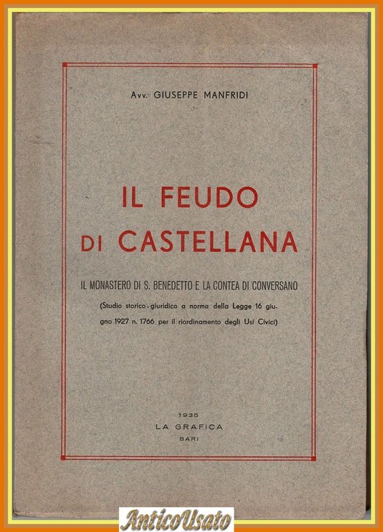 IL FEUDO DI CASTELLANA. Il Monastero di San Benedetto e la Contea di Conversano di Giuseppe Manfridi. Studio storico-giuridico a norma della Legge 16 giugno 1927 n. 1766 per il riordinamento degli Usi Civici. La Grafica, Bari, 1935. 199 Pagine. Copertina editoriale in brossura. Stato di conservazione: molto buono (pagine normalmente ingiallite, piega verticale).