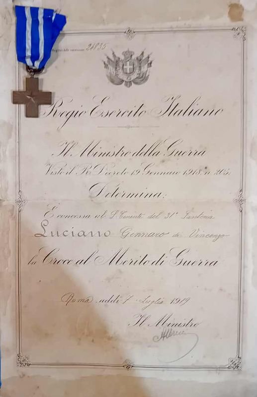 Attestato di cm. 39x25, 'Concessione di fregiarsi della Croce al Merito di Guerra' . Allegata la croce con nastro. Ingiallitura del documento.