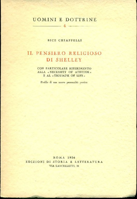 Con particolare riferimento alla «Necessity of Atheism» e al «Triumph of Life». Profilo di una nuova personalità poetica. Con 2 tavole in bianco e nero . 8vo. pp. 130. . Ottimo (Fine). . Prima edizione (First Edition). .