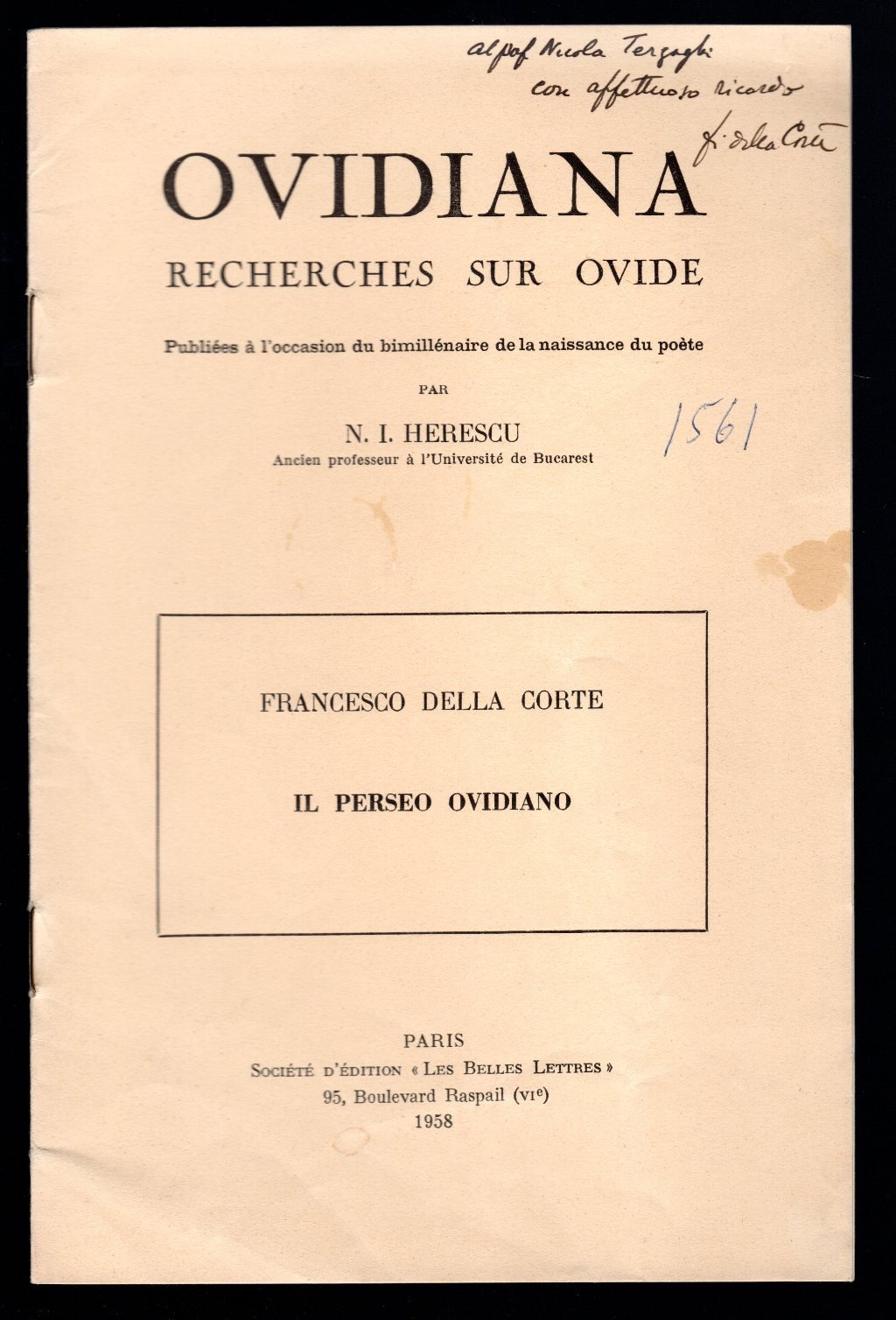 Opuscolo vintage in-8° con 6 pagg, Parigi, 1958. Saggi. Ovidiana. Recherches sur Ovide. Note a biro e dedica autografa dell'autore in copertina.