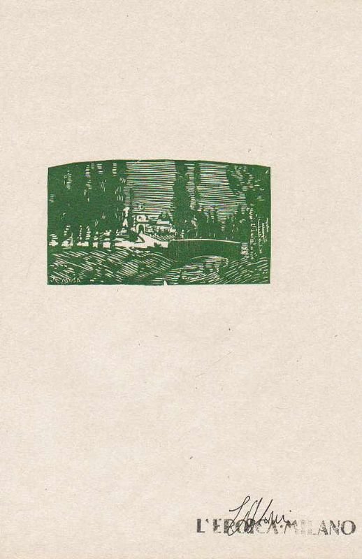 Foglio di cm 30 x 20 circa; l'immagine è stampata in inchiostro verde (cm 7 x 12). Prova di stampa della xilografia che andrà alla p. 45 del Quaderno 87-90 de L'Eroica, dedicato interamente a Giovanni Pascoli; al verso una poesia di Maddalena Bolla Caruso; nell'angolo in basso a destra timbro 'L'Eroica Milano' e firma del direttore della rivista, Ettore Cozzani. Ottimo stato di conservazione. Romeo MUSA (1882 - 1960) fu pittore, xilografo e scrittore. Studiò a Parma, allievo di Cecrope Barilli, e a Firenze, discepolo di Adolfo De Carolis. Dopo aver combatturo nella Prima Guerra Mondiale, nel 1924 venne trasferito all’Istituto magistrale di Campobasso, dove insegnò fino al 1933. Cominciò allora il periodo di intensa attività artistica, con la produzione di xilografie che illustrano la vita delle campagne molisane. Nel 1933 venne trasferito all’Istituto Magistrale Gaetana Agnesi di Milano. In quel periodo si dedicò particolarmente alla xilografia, anche illustrando libri e racconti per ragazzi. Con lo pseudonimo Musmeo o Musa da Calice celebrò con bonaria arguzia le gesta di Disolla e Tognu con poesie in dialetto valtarese, sempre illustrate con xilografie. Negli anni 1938-1945 affrescò alcune chiese: Codogno di Albareto, Bedonia, Allegrezze, Borgo val di Taro. Trattò ogni sorta di pittura: a olio, all’acquerello, a fresco, ed eseguì anche acqueforti e miniature. Ottenne la medaglia d’argento alla Mostra d’Arte Sacra de L’Aquila, altra del Ministero della Pubblica Istruzione alla I Mostra d’Arte molisana e la medaglia d’oro dal Circolo Artistico di Campobasso. Fu vice presidente degli Incisori d’Italia e partecipò a tutte le loro mostre. La matrice culturale del Musa affonda le radici nell’ambiente fiorentino, alla scuola di Adolfo Carolis, docente all’Accademia di Firenze. A contatto col fertile illustratore di gran parte della produzione letteraria di d’Annunzio, il Musa trasse dal maestro marchigiano illuminati insegnamenti. Si accostò all’inizio della sua attività allo spirito dei preraffaelliti, approdando in seguito allo studio profondo dell’opera michelangiolesca. Strettamente vincolato a una propria concezione romantico-letteraria dell’arte, ligio alla tradizione e ai canoni accademici, decisamente sensibile ai fermenti liberty, abilissimo disegnatore, si trovò, per naturale vocazione, nelle condizioni ideali per preparare ai difficili cimenti dell’incisione le nuove leve dei futuri artisti del Novecento. (da valcenostoria.it)