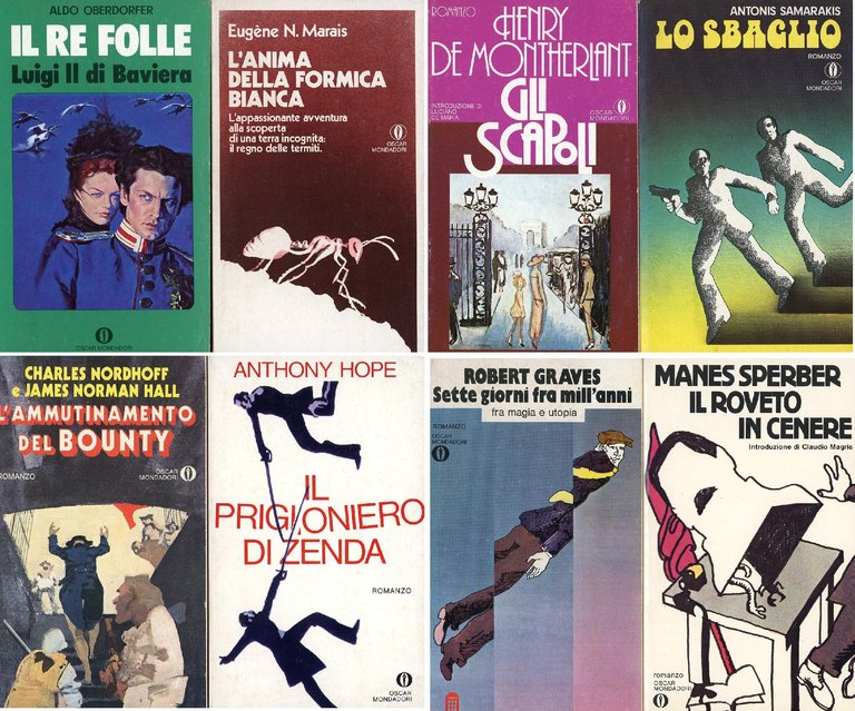 . 16mo. pp. 288. . Ottimo (Fine). . . . Si aggiungono altri 7 romanzi della stessa collana Oscar Mondadori: H. De Montherlant, Gli scapoli, 1980; 2) Antonis Samarakis, Lo sbaglio, 1975; 3) C. Nordhoff e J. Norman Hall, L'ammutinamento del Bounty, 1979; 4) Antony Hope, Il prigioniero di Zenda, 1979; 5) Robert Graves, Sette giorni fra mill'anni, 1976; 6) Manes Sperber, Il roveto in cenere, 1981; 7) Eugène N. Marais, L'anima della formica bianca, 1975