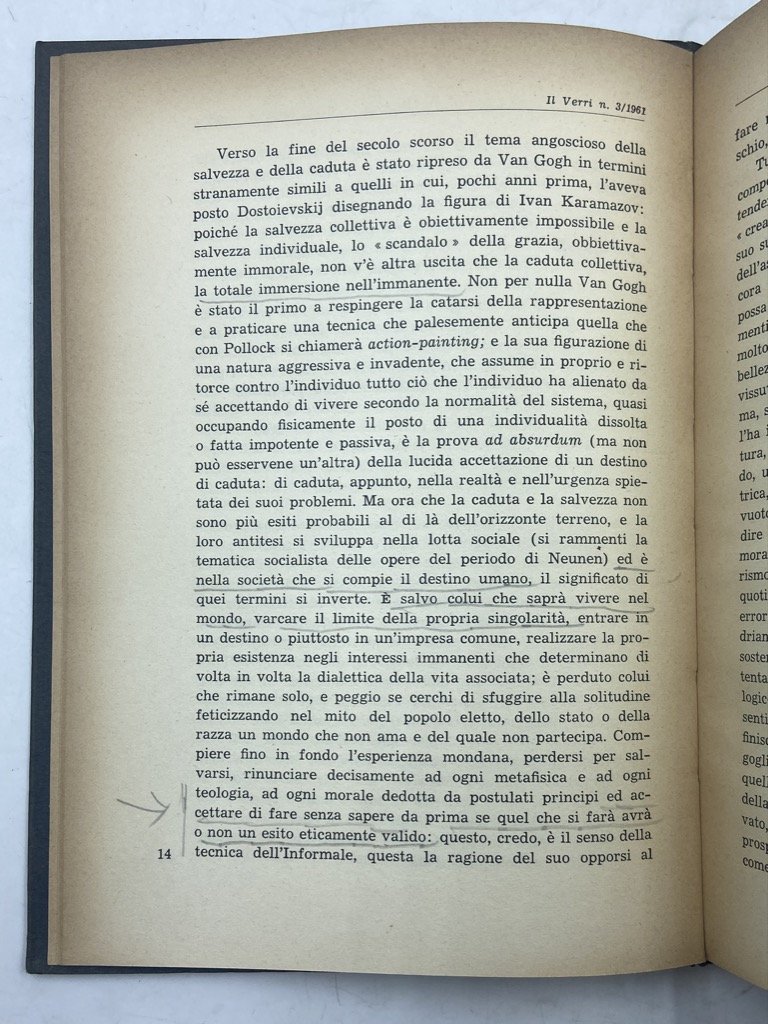 Brossura editoriale con risvolti, cm 20.5 x 15.5, pp 194 (18), 12 tavole in nero. Buon esemplare, qualche sottolineatura a lapis. Fascicolo monografico di una delle più significative riviste letterarie italiane del secondo Novecento, fondata da Luciano Anceschi nel 1956 e molto vicina al Gruppo 63 con Nanni Balestrini, Renato Barilli, Alfredo Giuliani, Leo Paolazzi e Giuseppe Pontiggia nel comitato di redazione. Nel 1961 Il Verri raccolse i più importanti critici e intellettuali italiani in questa atipica monografia che è rimasta uno strumento imprescindibile per comprendere l'esperienza dell'informale, l'espressionismo astratto e i fermenti artistici all'alba degli anni '60. La prima parte del volume raccoglie saggi di maggior respiro di Giulio Carlo Argan (Salvezza e caduta nell'arte moderna), Renato Barilli (Considerazioni sull'Informale), Enrico Crispolti (Ipotesi attuali) e Umberto Eco (L'Informale come opera aperta); la seconda sezione è dedicata ad una Breve antologia di poetica con testi di artisti e critici: Francis Ponge, Lucio Fontana, Michel Tapié, Jean Dubuffet, Jean-José Marchand, René Guilly, Will Baumeister, Jackson Pollock, Clement Greenberg, Eduard Jaguer, Samuel Beckett, Giuseppe Capogrossi, Alberto Burri, Willem De Kooning, Harold Rosenberg, Francis Bacon, James Johnson Sweeney. La terza parte, intitolata Validità dell'Informale, vede contributi di Umbro Apollonio, Francesco Arcangeli, Stefano Bottari, Cesare Brandi, Palma Bucarelli, Maurizio Calvesi, Emilio Cecchi, Giacomo Devoto, Renato Lazzarini, Enzo Paci, Mario Pensa, Franco Russoli, Ugo Spirito, Giovanni Urbani, Lionello Venturi, Giulia Veronesi. Cesare Vivaldi, Carlo Volpe. Relazioni dell'Informale è il titolo del segmento conclusivo del fascicolo, con scritti di Rosario Assunto, Albino Galvano, Gillo Dorfles ed Edoardo Sanguineti.
