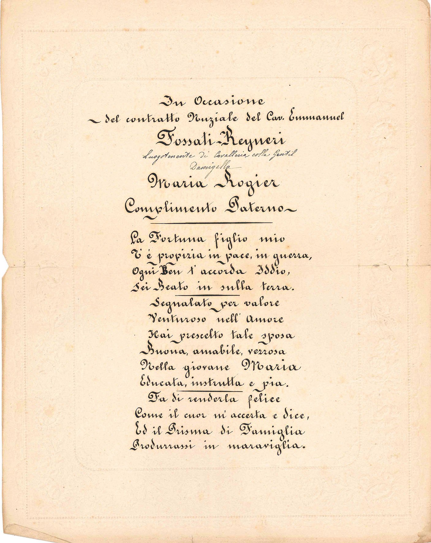 In occasione del contratto nuziale del Cav. Emmanuel Fossati-Reyneri luogotenente di cavalleria colla Gentil Damigella Maria Rogier