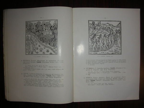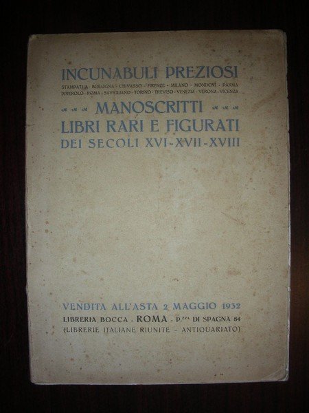 in-8, pp. 78, bross. edit. Catalogo figurato, anche da tavv. a colori, della Libreria Bocca di Roma, dedicato esclusivamente agli incunaboli italiani, suddiviso per luoghi di stampa, e a libri rari e figurati di alta epoca.