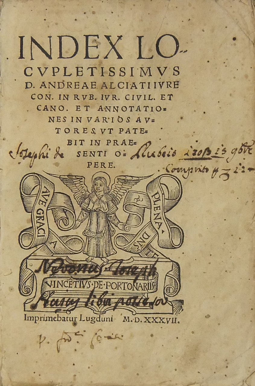 Index locupletissimus. in rub. iur. civil. et cano. et Annotationes in varios autores ut patebit in praesenti opere). UNITO A: Paradoxorum ad Pratum libri sex. Eiusdem in libros quorum nomina in seq. pag. reperies; UNITO A: Dispuncionum Liber primus-secundus De eo quod interest liber In tres posteriores Codicis Iustiniani Libros Annotatiunculae Praetermissorum Liber primus-secundus Declamatio una De stipu. divisionib. Commentariolus