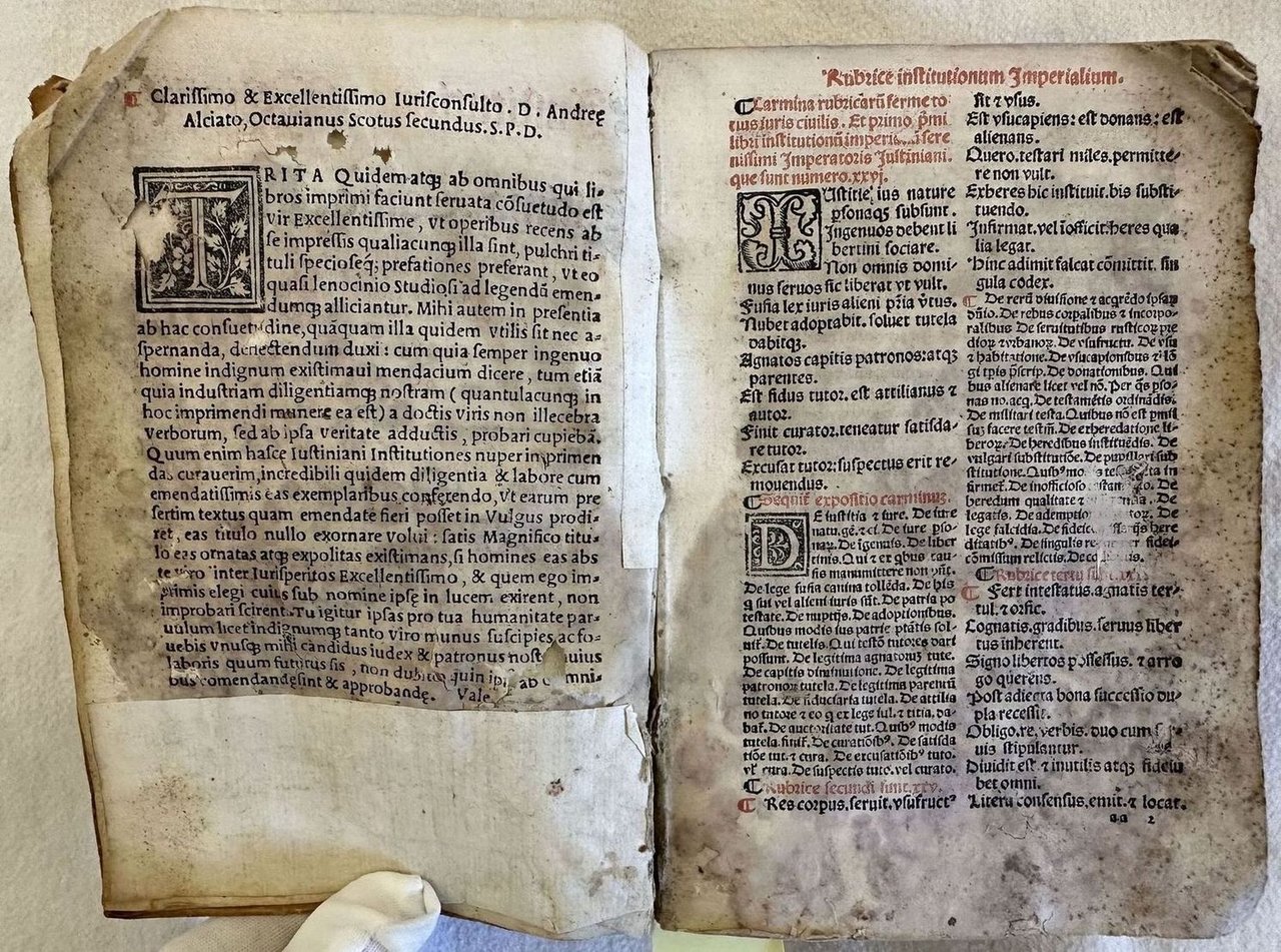 Edizione veneziana del 1535 delle celebri Institutiones juris civilis delle Institutiones di Giustiniano. Numerazione singola e testo in nero e rosso a doppia colonna e incorniciato. Il testo è impreziosito da ventidue finissime incisioni su legno che illustrano gli argomenti trattati. Antiche note manoscritte su tutto il volume risalenti al 1580 circa per compatibilità di tratto e inchiostro con una nota all'ultima carta datata 25 maggio 1580. Rinforzo al frontespizio che ha causato qualche manzanza nel testo. In buone condizioni. Copertina in piena pergamena con lacci e titolo manoscritto al dorso in buone condizioni generali con lievi usure ai margini e dorso. Mancanze. Legatura in buone condizioni. All'interno le pagine si presentano in buone condizioni con rare fioriture. Pagina da 147 a 149 presentano strappi con parte mancanti (presenti tutte le mancanze tranne una porzione di testo a pag. 149); piccola mancanza a pag. 233 con leggera perdita di testo. Rinforzo al frontespizio che ha causato una parziale perdita di testo. In 16. Dim. 16x12 cm. Pp. (56)+381+(1) Venetian edition of 1535 of the famous Institutiones juris civilis of Institutiones of Justinien. Single numbering and red and black text sometimes in a frame. IThe text is enriched by 22 woodcuts illustrating the main themes of the book. Ancient handwritten notes in the hole volume of 1580 circa that can be dated thanks to an handwritten note of 25th of may 1580 in the last page. Reinforcement in the title page that caused a lacking in the text. In good conditions. Full parchment cover with laces and handwritten title in the spine in good general conditions lightly worn in the extremities. Lackings, Binding in good conditions. Inside pages are in good conditions with occasional foxing. Pages from 147 to 149 have tears with lackings (there are all the missing parts excepting one of pag. 149); Little lacking in pag. 233 with light loss of text. Reinforcement in the title page that caused a loss of text. In 16. Dim. 16x12 cm. Pp. (56)+381+(1)