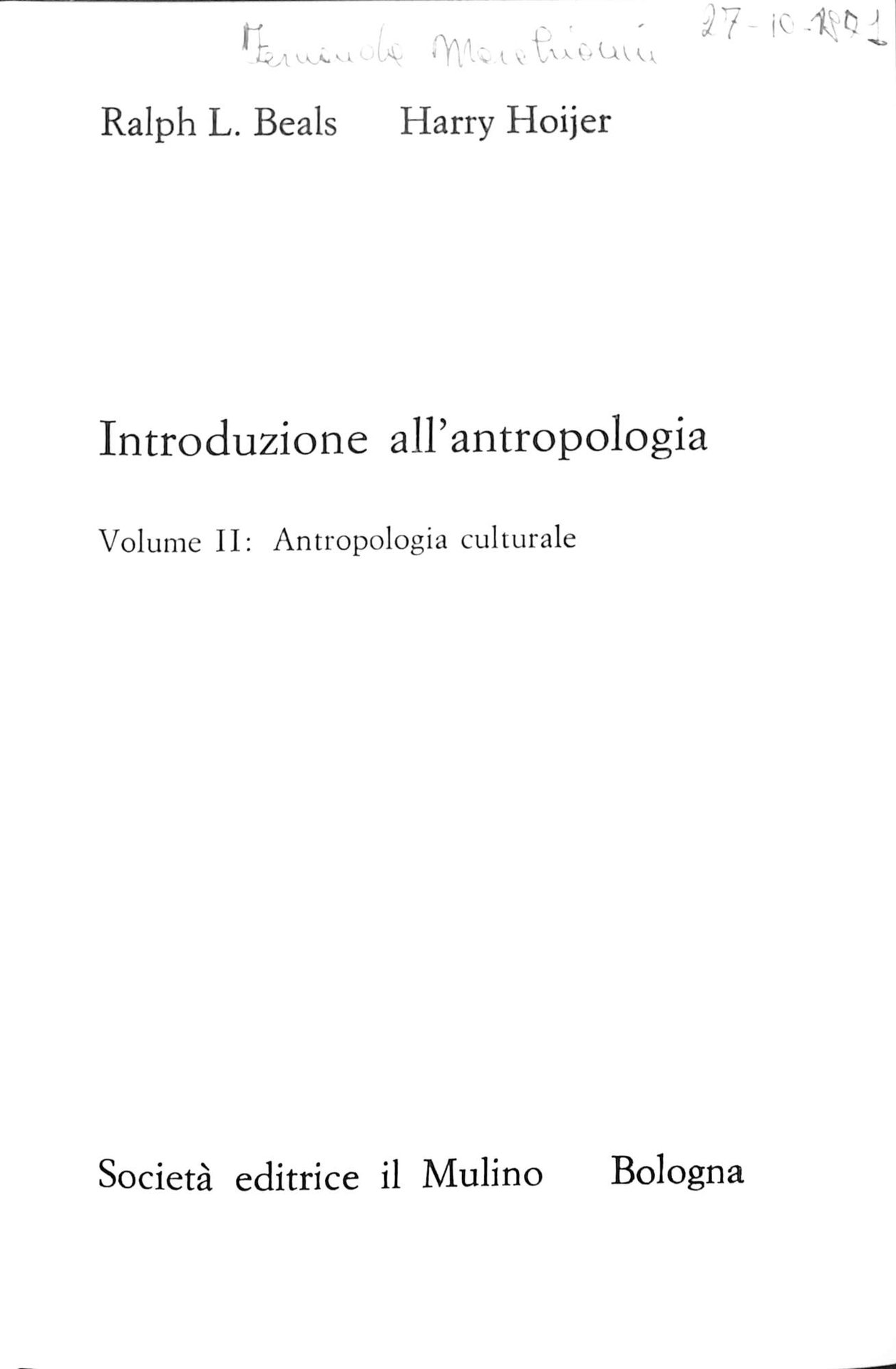 Introduzione all'antropologia Volume II: Antropologia culturale | Libri antichi e moderni | L. Beals, Ralph-Hoijer, Harry