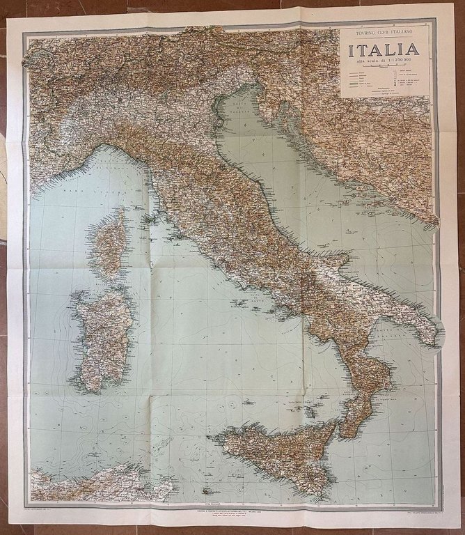 Bella mappa del 1948 della Carta d'Italia del Touring Club italiano dell'Italia. DIMENSIONI FOGLIO: cm 101x88<BR>DIMENSIONI INCISIONE: cm 94,5x81<BR>EPOCA: 1948 CONDIZIONI: Ottime. Piegature.Beautiful map of 1948 of the Italian map of Touring Club italiano of Italy. LEAF DIMENSION: 101x88 cm<BR>ENGRAVING DIMENSION: cm 94,5x81<BR>DATE: 1948 CONDITIONS:Very good conditions. Foldings