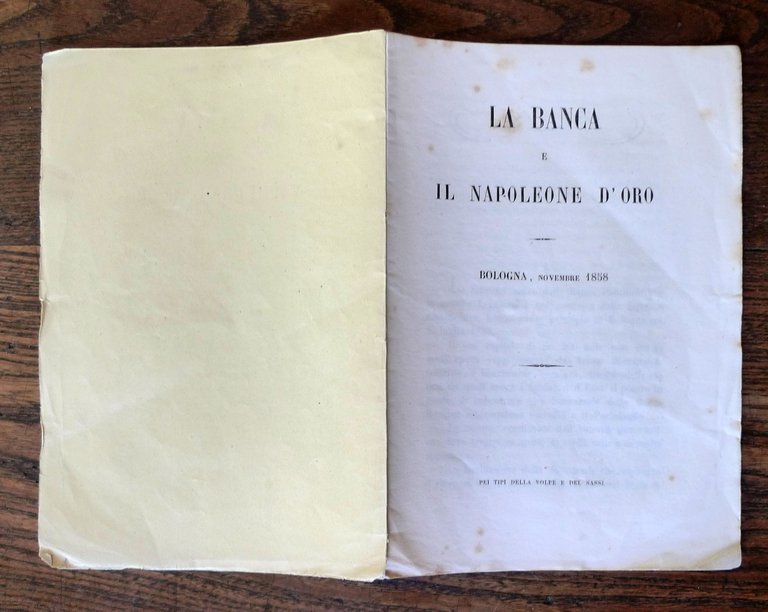 [Anonimo, B.P. Osima]LA BANCA E IL NAPOLEONE D'ORO.Bologna, novembre 1858,pei tipi Della Volpe e del Sassi,21x14 cm., pp.14,peso: g.300cod.10341CONDIZIONI DELL'OPUSCOLO: buone,manca il piatto anteriore,fioriture