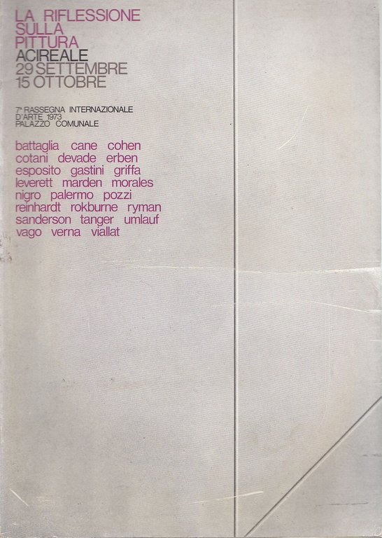 Volume edito in occasione della 7a Rassegna Internazionale d'arte 1973 di Acireale, Palazzo Comunale, 29 settembre - 15 ottobre 1973. Scritti critici di Filiberto Menna ("Per una linea analitica dell'Arte Moderna"), Italo Mussa ("Colore/Tela/Pennellata/Pittura"), Tommaso Trini ("Il quadro della pittura"). Testi critici degli artisti. Numerose ill. in nero (riproduzioni delle opere esposte di Carlo Battaglia, Louis Cane, Paolo Cotani, Bernard Cohen, Marc Devade, Ulrich Erben, David Leverett, Marco Gastini, Brice Marden, Carmengloria Morales, Mario Nigro, Ad Reinhardt, Dorotea Rokburne, Robert Ryman, Susanne Tanger, Lynn Umlauf, Claudio Verna, Claude Viallat, Giorgio Griffa, et al.) . 4to. pp. 120 circa n.n.. . Molto buono (Very Good). Cerniere leggermente sciupate (Slightly worn covers). . .