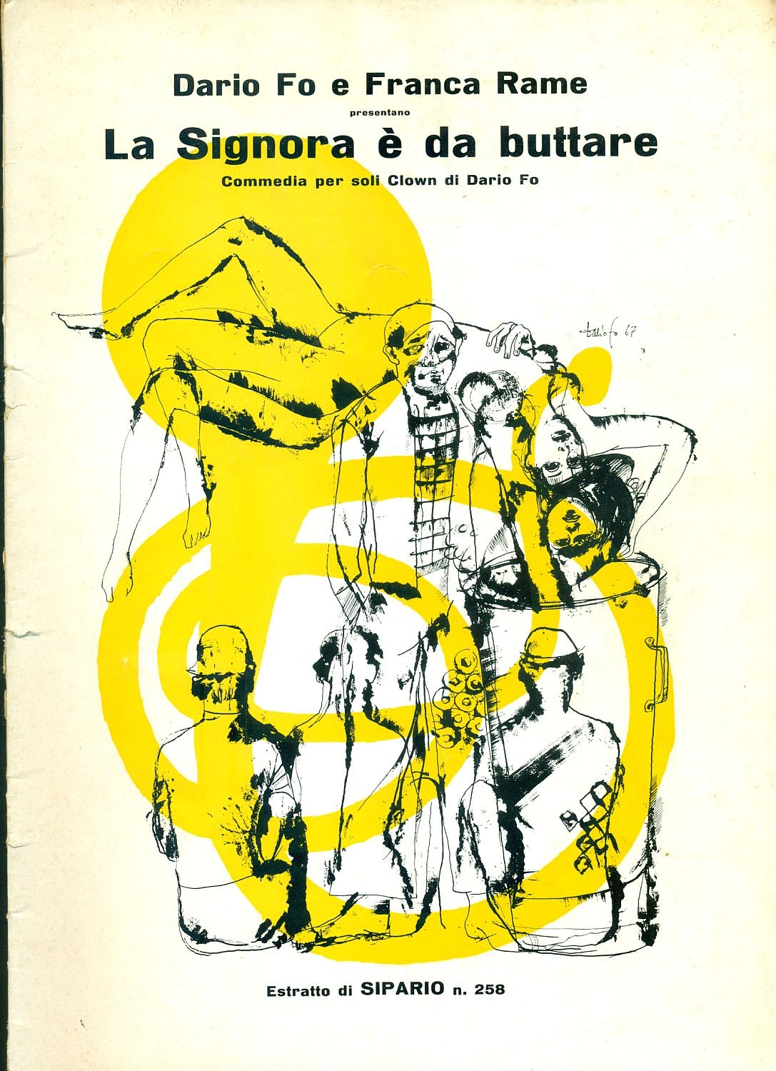 Commedia per soli clown di Dario Fo. Con la collaborazione di Ezio Mariano e Valerio Ruggeri. Regia, scene e costumi di Dario Fo. Musiche di Fiorenzo Carpi eseguite da Oscar e "le mani pesanti". Estratto dalla rivista Sipario N.258. Testo di presentazione di Ettore Capriolo. Diverse fotografie in bianco e nero Copertina illustrata da Dario Fo. 8vo (cm 28,5X20,5). pp. 24. . Molto buono (Very Good). . . .