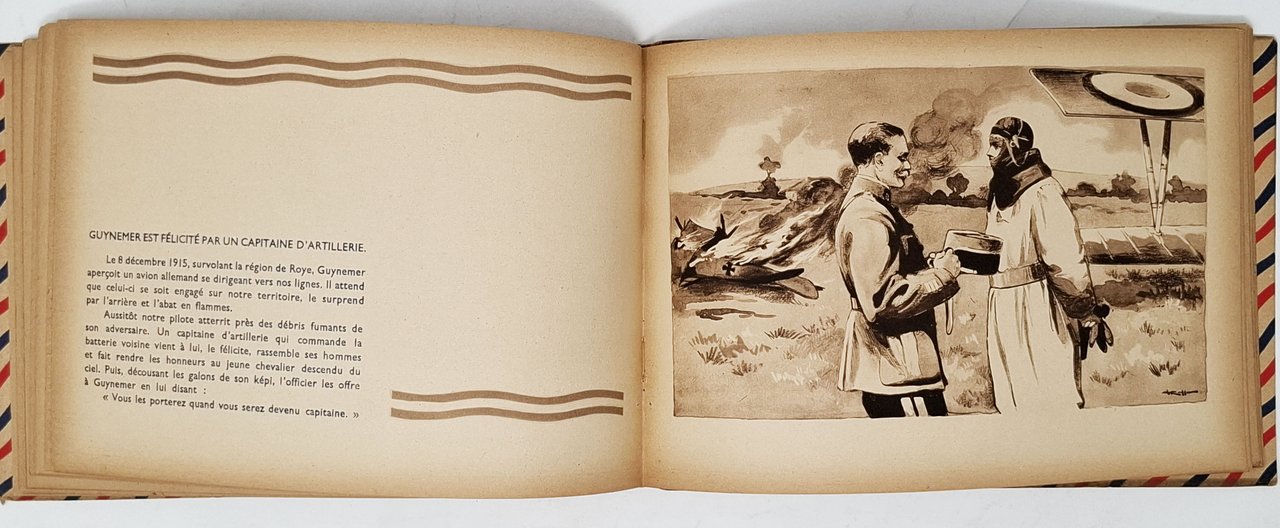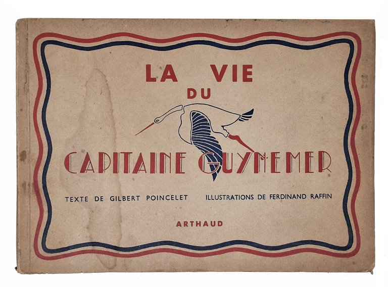 Texte de Gilibert Poincelet. Illustrations de Ferdinand Raffin. Prima edizione. Lingua del testo: francese. Pagine: 15 + [51]. Formato: 25 x 18 cm circa. Stato di conservazione: un alone sul piatto anteriore, minuscli taglietti senza mancanze sui bordi della copertina, un taglio di circa5,5 cm a partire dal bordo superiore a scendere, in corrispondenza della linea di attaccatura tra il piatto anteriore e il dorso; bruniture della carta ma, nel complesso, un esemplare più che discreto. Privo di firme d'appartenenza, timbri o altri segni a matita o a penna nel testo. Copertina editoriale flessibile, illustrata a due colori: rosso e blu. Con 23 tavole a piena pagina illustrate da Raffin. Quest'opera di Poincelet, pubblicata nel contesto della Seconda Guerra Mondiale, è una biografia di Georges Guynemer (uno degli assi dell'aviazione francese della Prima Guerra Mondiale), qui descritto come un eroe nazionale, un simbolo di coraggio e sacrificio. La narrazione tende all'esaltazione delle gesta dell'aviatore per ispirare patriottismo. Può quindi essere definita come un'opera di stampo biografico-celebrativo, caratterizzata (grazie alle tavole in seppia di Raffin) da una forte componente visiva.