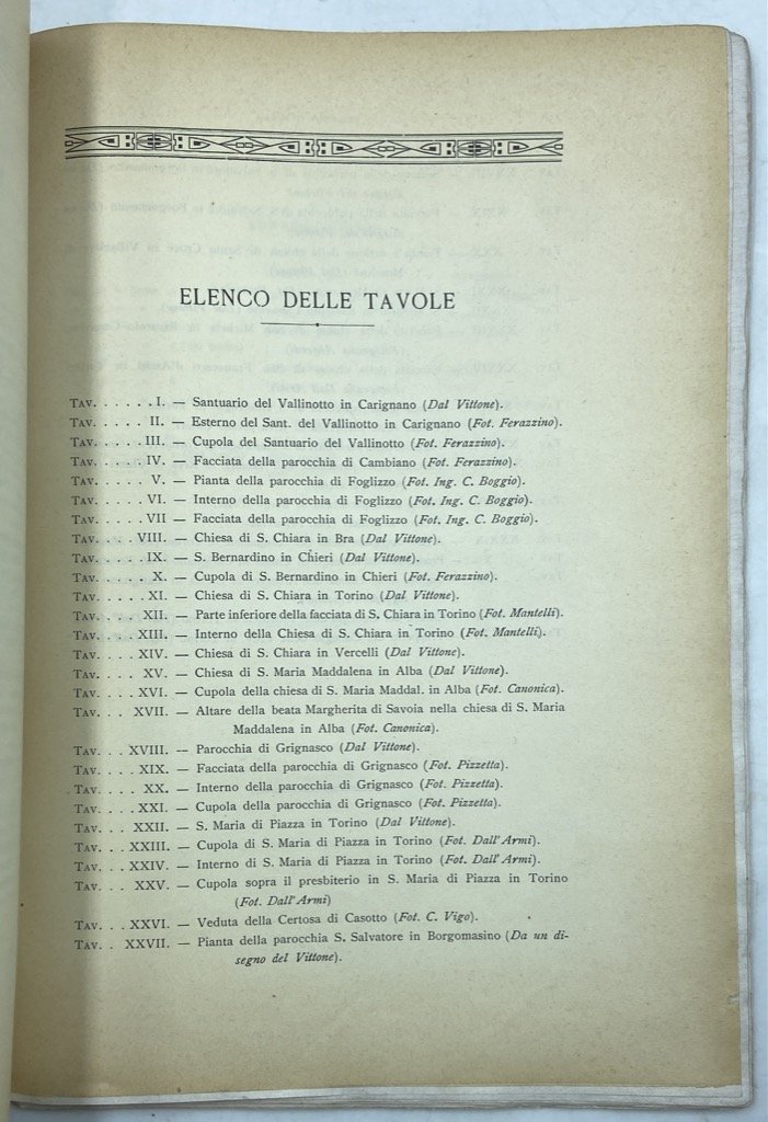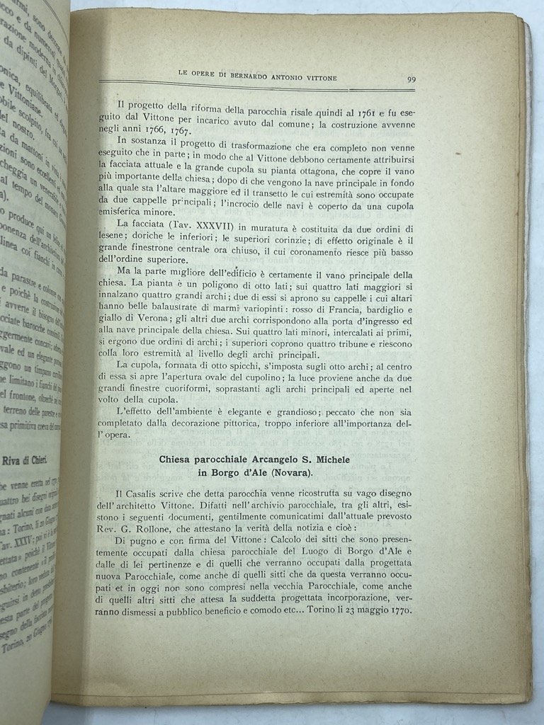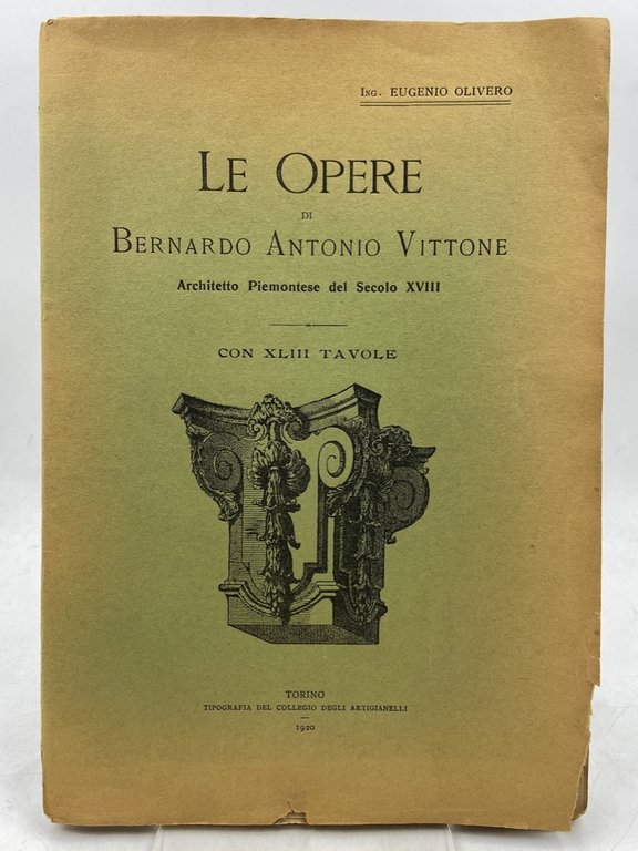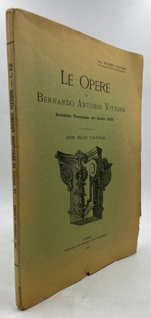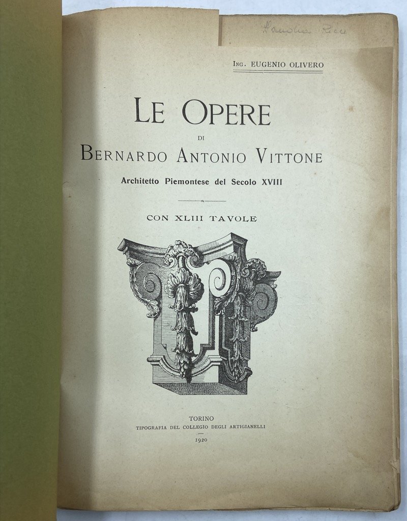 Brossura editoriale illustrata, cm 27.5 x 19, pp 130 (2) + XLIII tavole in nero. Difetti sulla brossura e sui margini di qualche pagina, alcuni disegni a lapis su pagina 2 e 3, firma ritagliata sul frontespizio. Edizione originale della prima monografia dedicata all’architetto torinese di origine canavesana Bernardo Antonio Vittone (Torino 1704 - 1770), tra i maggiori esponenti del tardo barocco piemontese, autore di un fortunato manuale di architettura e prolifico progettista di chiese a Torino e nel contado sabaudo. Olivero, ingegnere e storico dell’architettura, fu segretario e presidente della Società Piemontese di Archeologia e Belle Arti nonché co-direttore con Vittorio Viale dei Musei Civici di Torino.