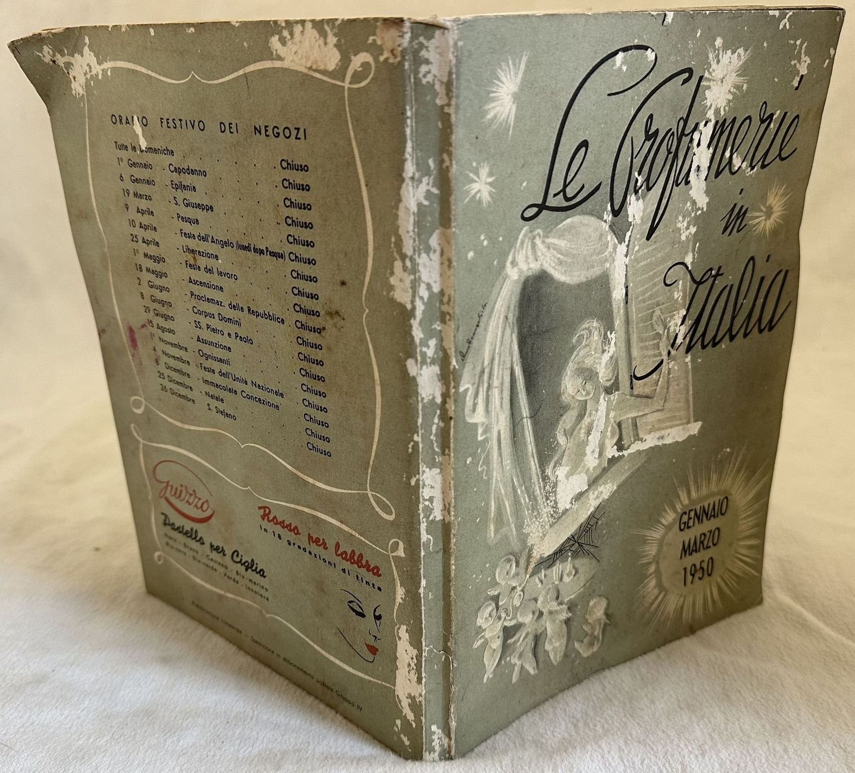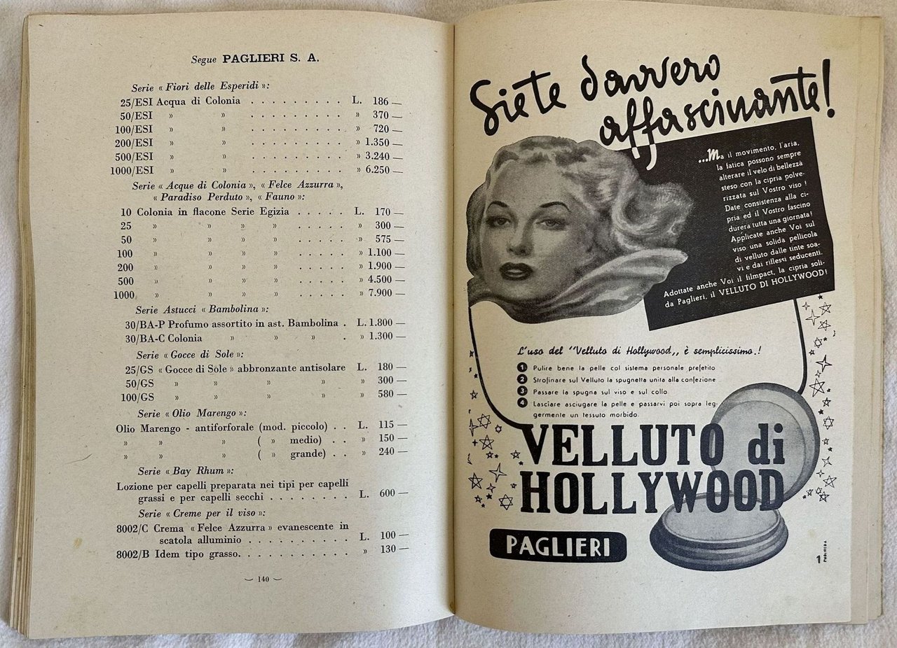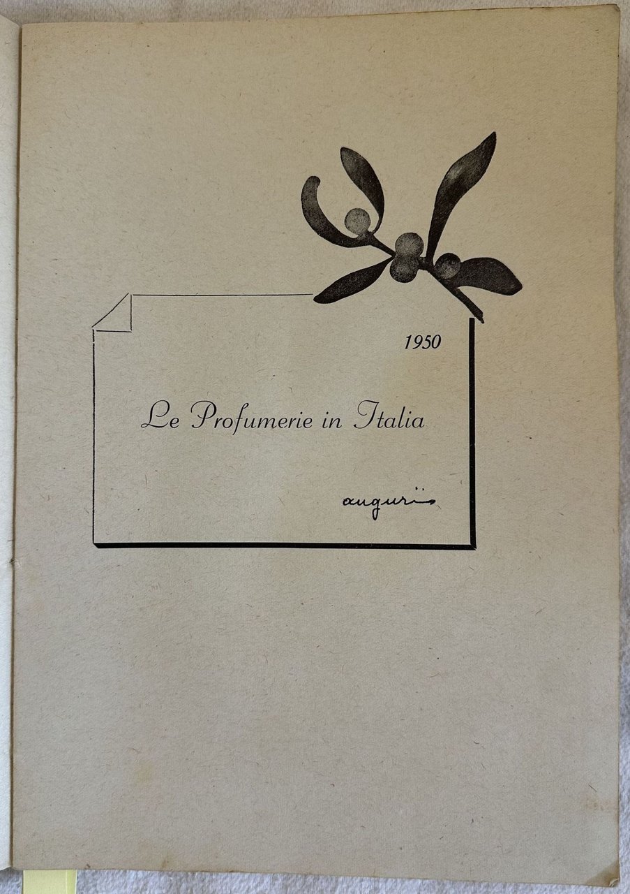Catalogo del gennaio-marzo 1950 delle profumerie in Italia. Presente elenco delle profumerie nelle diverse città e in ognuna i prodotti presenti con lista prezzi. Sono indicati profumi, trucchi, prodotti di bellezza. Numerose pubblicità d'epoca a piena pagina (Paglieri, Pinaud, Dop, orchiedea nera, Pogosan, Flor-mar, Vido, Coty, Bourjois ecc. ). In buone condizioni. Copertina editoriale in buone condizioni generali con lievi usure ai margini e dorso. Usure e macchie. Legatura in buone condizioni. All'interno le pagine si presentano in buone condizioni con rare fioriture. In 8. Dim. 24x17 cm. Pp. 203+(3) Catalogue of january-march 1950 of perfume shops in Italy. There is the list of perfume shops in each city and in each one the products with price list. There is indication of perfumes, cosmetics, beauty products. Different full-page advertisings (Paglieri, Pinaud, Dop, orchiedea nera, Pogosan, Flor-mar, Vido, Coty, Bourjois ecc. ). In good conditions. Editorial cover in good general conditions lightly worn in the extremities. Wearings and stains, Binding in good conditions. Inside pages are in good conditions with occasional foxing.In 8. Dim. 24x17 cm. Pp. 203+(3)