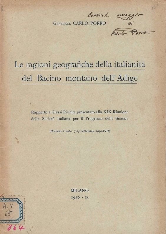 Le ragioni geografiche della italianità del Bacino montano dell'Adigwe. (Rapporto a Classi Riunite. Soc. per il progresso delle Scienze. (Bolzano-Trento, 1930). | Libri antichi e moderni | Porro Carlo.