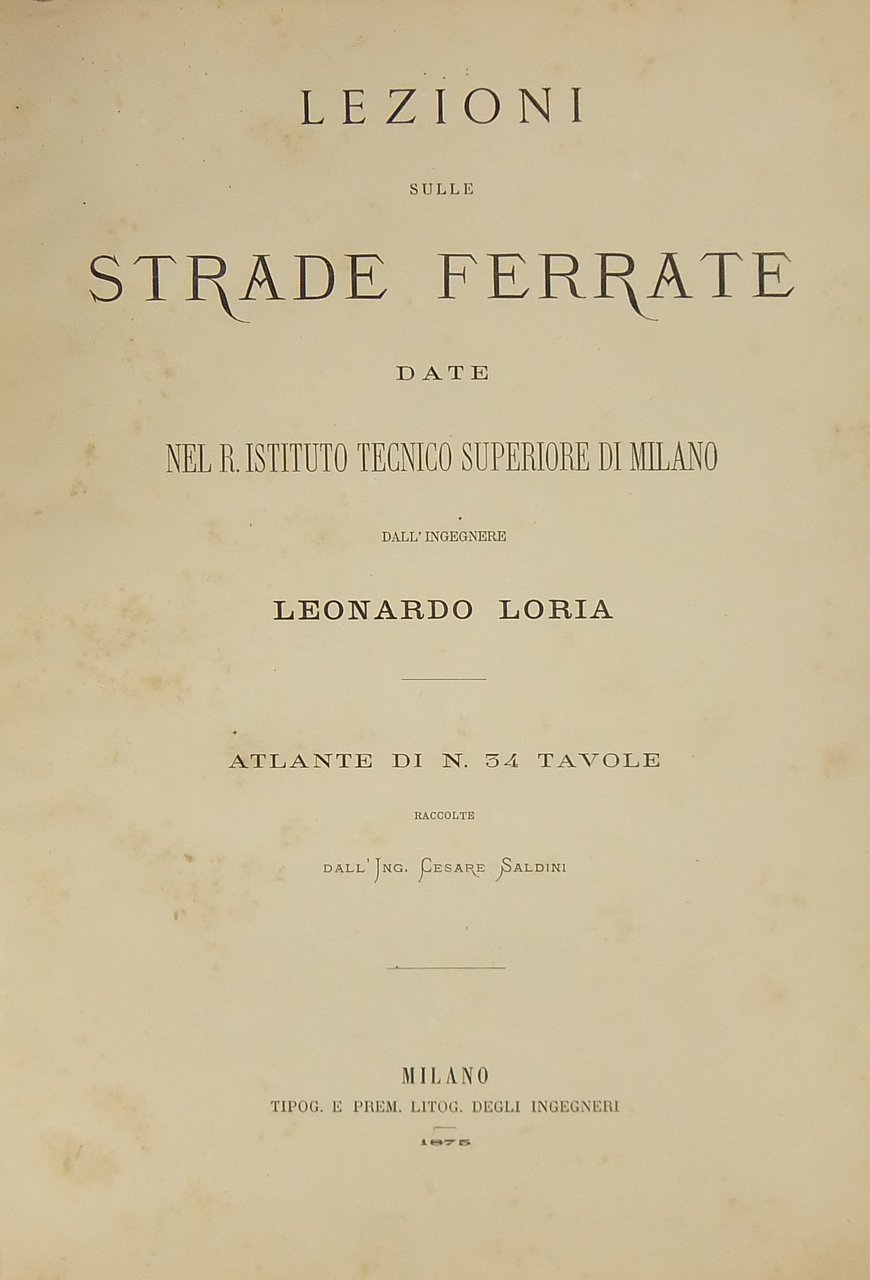 Lezioni sulle strade ferrate. Date nel R. Istituto tecnico superiore di Milano. Atlante di n. 34 tavole raccolte dall'Ing. Cesare Saldini | Libri antichi e moderni | Loria Leonardo
