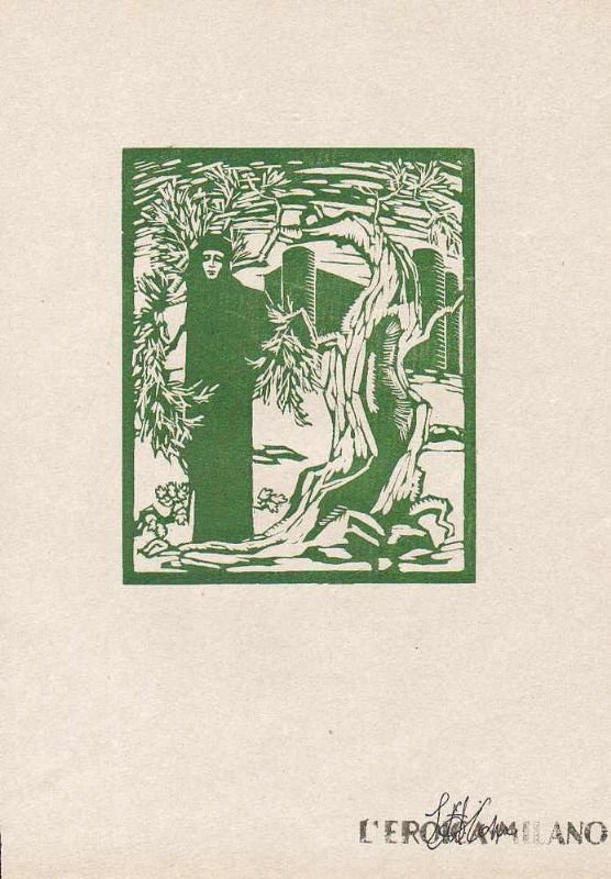 Foglio di cm 30,5 x 21,5 circa; l'immagine è stampata in inchiostro verde (cm 14,5 x 12). Prova di stampa della xilografia che andrà alla p. 35 del Quaderno 87-90 de L'Eroica, dedicato interamente a Giovanni Pascoli; al verso liriche di Olinto Dini; nell'angolo in basso a destra timbro 'L'Eroica Milano' e firma del direttore della rivista, Ettore Cozzani. Ottimo stato di conservazione. Luzio LANSEL fu xilografo, attivo nella prima metà del XX secolo; collaborò, oltre che a L'Eroica, a Bottega d'Arte.