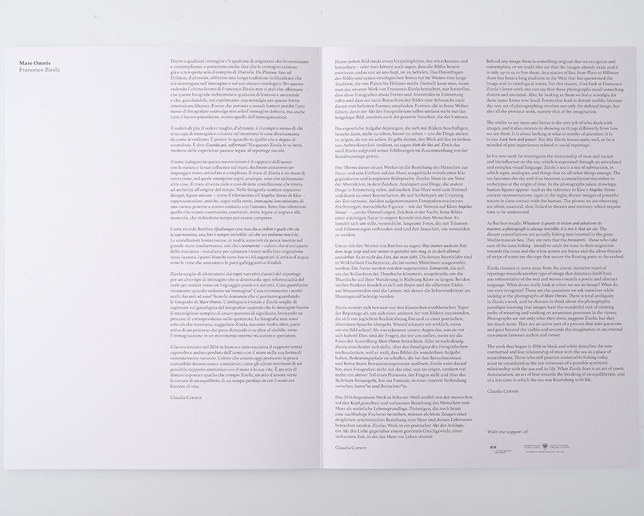 Fotografie in bianco e nero di Francesco Zizola, selezionate dalla mostra Mare Omnis. Un testo in italiano, inglese e tedesco di Claudia Corrent Design di Nicolò Degiorgis e direzione di Katharina Kolakowski. 4to (32x24 cm). pp. 16. . Perfetto (Mint). . Prima edizione (First Edition). . Mare Omnis è una raccolta di 22 fotografie scattate da Francesco Zizola.Il tema indagato nella mostra è il rapporto dell'uomo con la natura e della sua influenza sul mare declinato attraverso un linguaggio visivo articolato e complesso.Il mare di Zizola è un mare di sottrazione, nel quale emergono segni, analogie, cose che richiamano altre cose. Il mare diventa cielo e così diviene costellazione che rinvia ad archetipi all'origine del tempo.Nelle fotografie scattate appaiono disegni, figure umane, rappresentazioni antiche, segni nella notte, immagini lontanissime di una natura potente in stretto contatto con l'uomo.