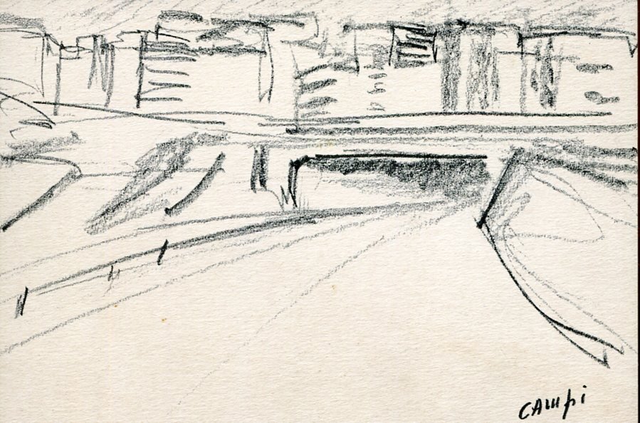 Cartolina postale d'invito all'inaugurazione della mostra "Periferie" di Massimo Campi presso la Galleria Lazzari, Roma, sabato 22 marzo 1997. Al fronte un'illustrazione in bianco e nero . Cm 10x15. . . Molto buono (Very Good). . . .