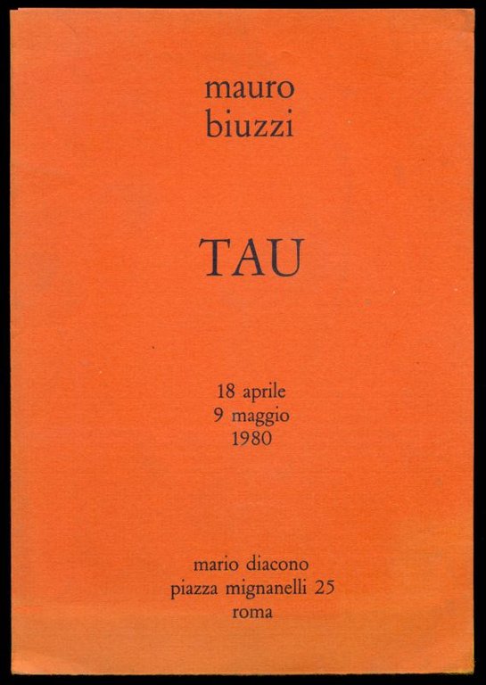 Pieghevole della mostra TAU di Mauro Biuzzi, presso Mario Diacono, Piazza Mignanelli 25, Roma 18 aprile - 9 maggio 1980. Testo critico di Mario Diacono. Allegata busta con fotografia a colori della Casa della Precisione e dell'Anima di Biuzzi . Cm 24x17. pp. 6. . Molto buono (Very Good). . . .