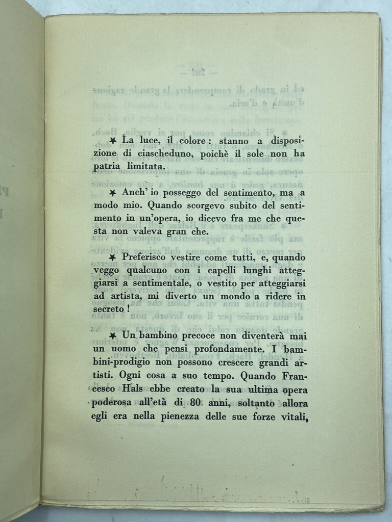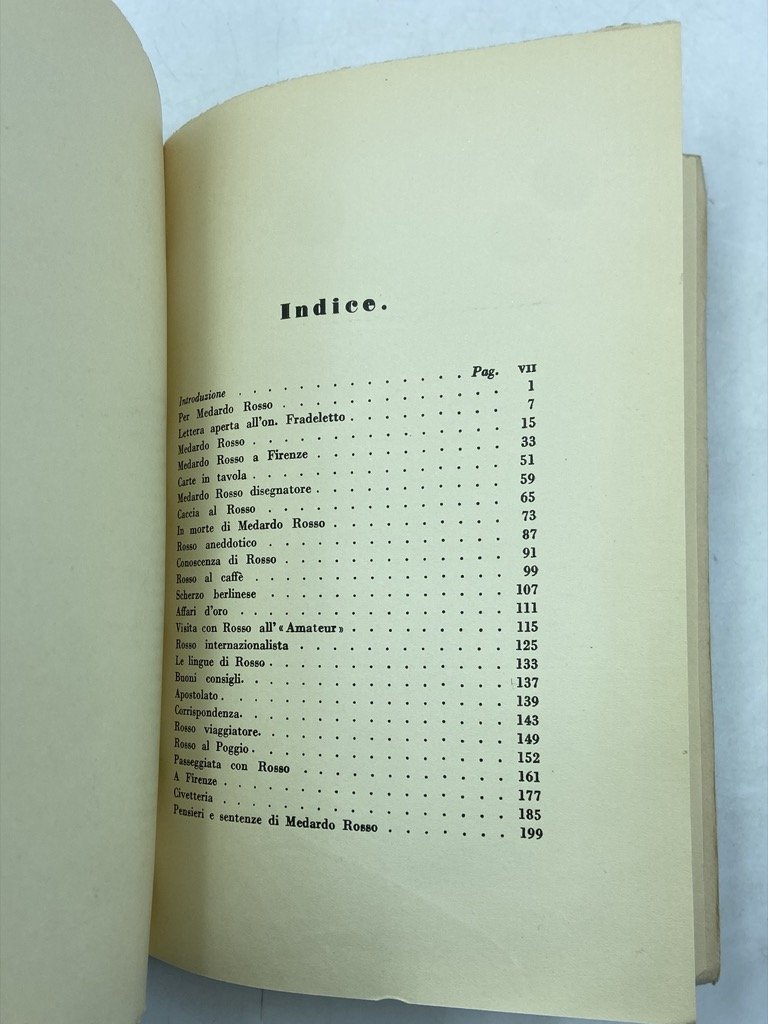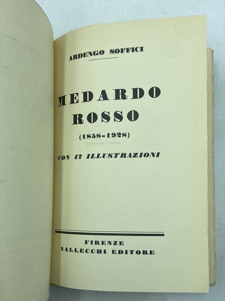 Brossura editoriale, cm 19.5 x 14, pp XXII 206 (4), 42 tavole in nero. Buono stato, lievi segni del tempo. Edizione originale. Soffici raccolse i propri scritti dedicati a Medardo Rosso (Torino 1858 - Milano 1928), parzialmente apparsi sulle pagine de La Voce, all'indomani della scomparsa dello scultore «in un momento propizio alla sua gloria - ch’io vado da un quarto di secolo affrettando invano». Illustrato con riproduzioni di autografi e disegni, fotografie delle sculture e ritratti fuori testo. Gambetti Vezzosi, p. 876; Spaducci, p. 278.
